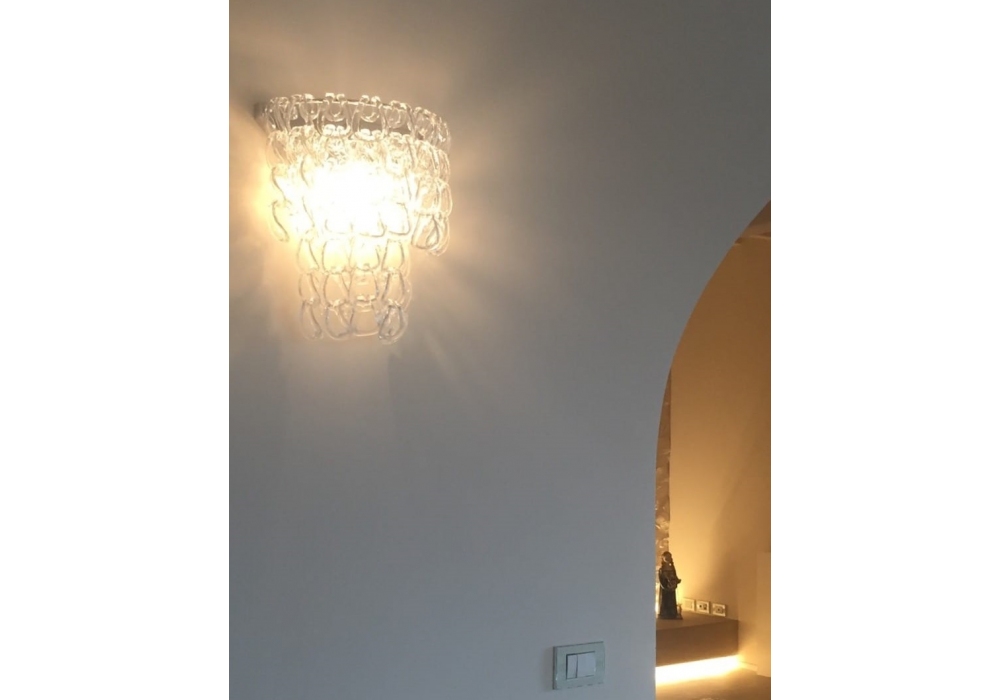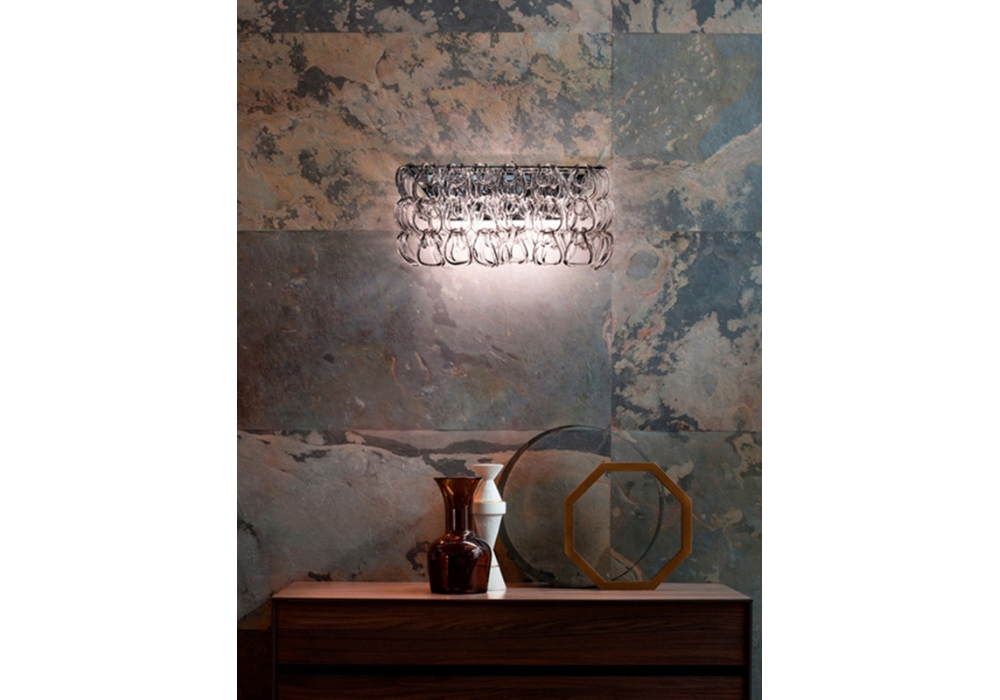 Giogali conçue par Angelo Mangiarotti pour Vistosi est une applique avec structure portante en métal couleur bronze ou chrome. La partie du diffuseur est décorée de multiples anneaux en cristal et abrite une source lumineuse LED ou halogène dimmable avec culot E14 ou E27. Giogali est disponible en différents modèles et finitions.