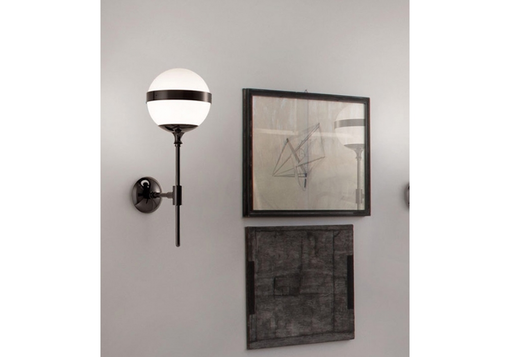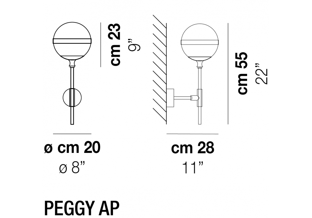 Peggy conçue par Hangar Design Group pour Vistosi est une applique avec structure et ancrage mural en métal peint. Le diffuseur est sphérique en verre blanc brillant et protège une source lumineuse avec une douille E14 dimmable. Peggy est disponible en différentes finitions.