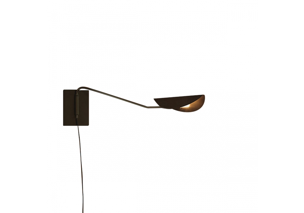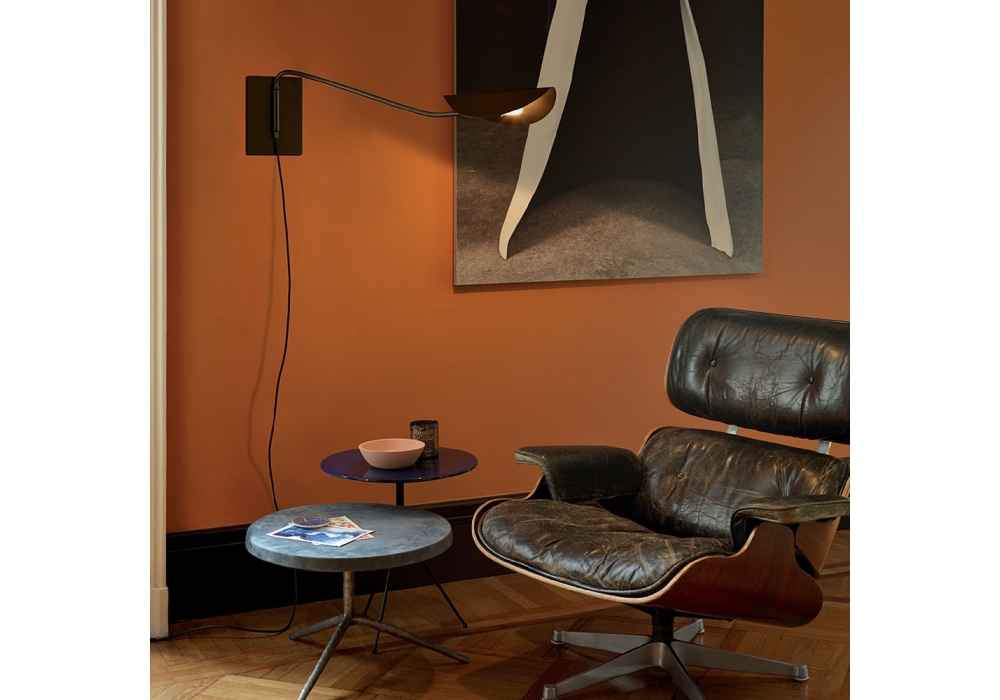 Plume conçue par Christophe Pillet pour Oluce est une applique murale en métal tubulaire courbé peint en couleur bronze. Le diffuseur est en métal et protège une source lumineuse. Plume est disponible en différentes tailles.