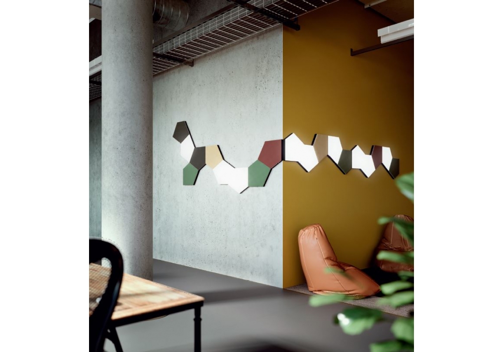 Tile conçue par Sebastiano Tosi pour Penta est une applique murale ou plafonnier modulaire blanche avec structure en métal verni graphite. Le diffuseur est blanc opale également équipé d'un panneau insonorisant décoratif et protège une source de lumière LED dimmable dans différentes nuances et lumière.