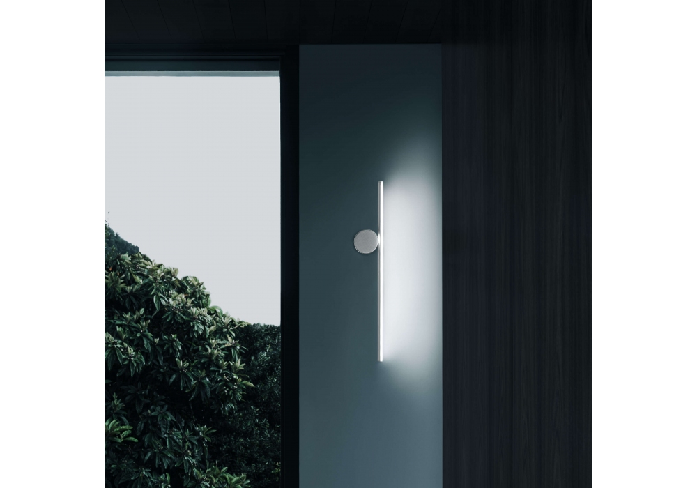 Coordinates Wall 1 conçue par Michael Anastassiades pour Flos est une applique à lumière diffuse composé d'une tige horizontale. Chaque tige est constituée d'un corps en aluminium extrudé, usiné et anodisé et d'un diffuseur en silicone optique platine avec bande LED intégrée. Chaque modèle est équipé de sa propre rosace, dont l'électronique intégrée utilise uniquement le système de gradation TRIAC.