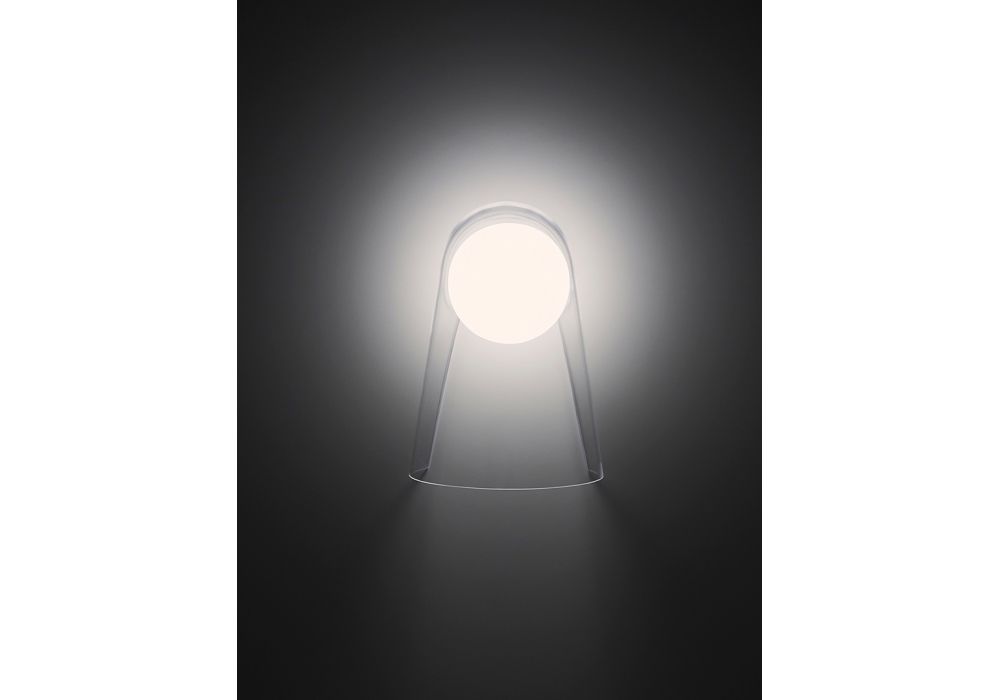 Satellight conçue par Eugeni Quitllet pour Froscarini est une applique structurée par un corps en verre transparent en forme de cloche. Le diffuseur est sphérique en verre soufflé blanc opaque et abrite une source lumineuse LED ou halogène avec connexion G9.