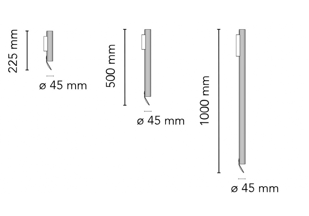 | Dimensions | Ø 4,5 x Ø 7,3 x H 22,5 cm; Ø 4,5 x Ø 7,3 x H 50 cm; Ø 4,5 x Ø 7,3 x H 100 cm. |