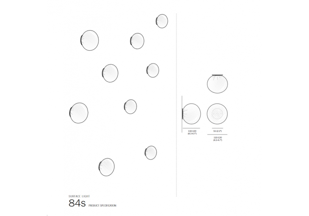84 conçue par Omer Arbel pour Bocci est une applique avec diffuseur en verre fait main, avec source lumineuse LED ou Xénon dans différentes nuances de lumière. Le support structurel est en métal. 84 est disponible en deux versions différentes 84s et 84sp. le 84s ne se connecte pas directement au secteur, mais via une alimentation électrique ; tandis que le 84sp a une alimentation intégrée et peut être connecté directement au secteur.