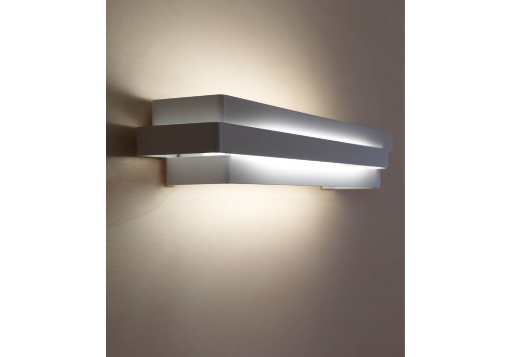 Escape 50 conçue par Serena Papait pour Quadrifoglio Group est une applique composée de éléments en aluminium, disposés horizontalement et parallèles les uns aux autres. Disponible en différentes finitions.
