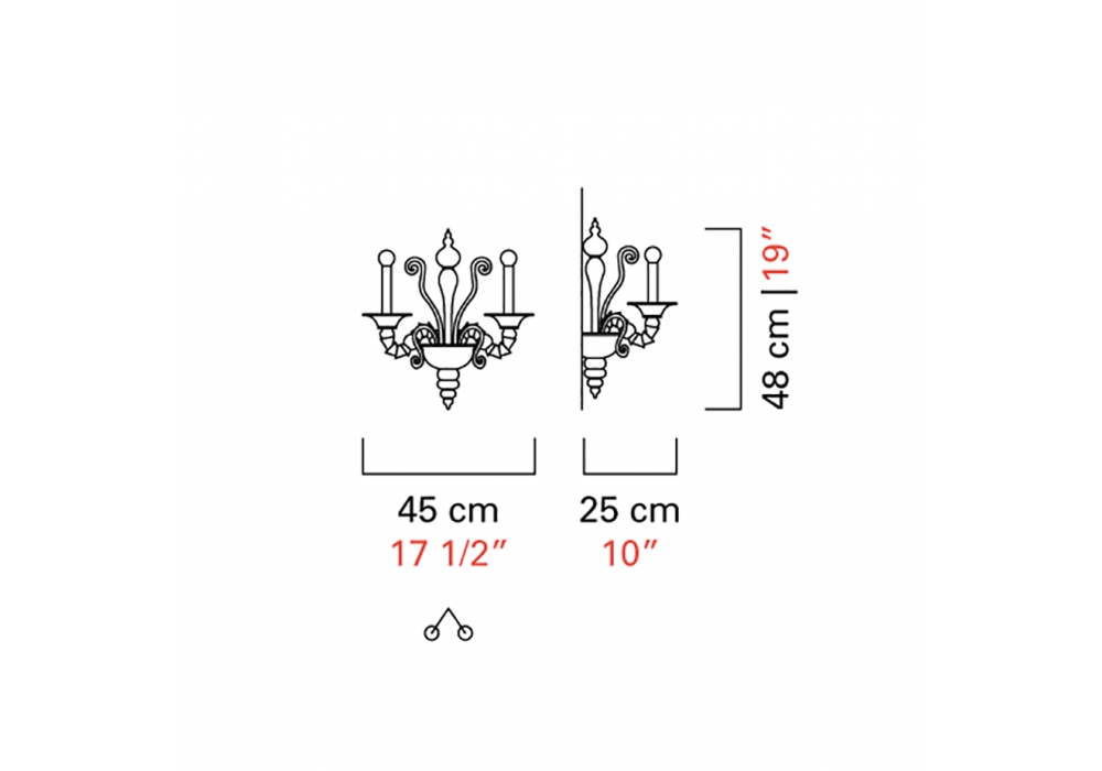 Riyadh conçue et produite par Barovier & Toso est une applique murale avec structure de support et détails en métal galvanisé doré ou chromé poli. La structure et les bras sont recouverts de verre vénitien avec des pendentifs en cristal et adoptent des sources lumineuses LED ou halogènes dimmables. Ryadh est disponible en différentes finitions.