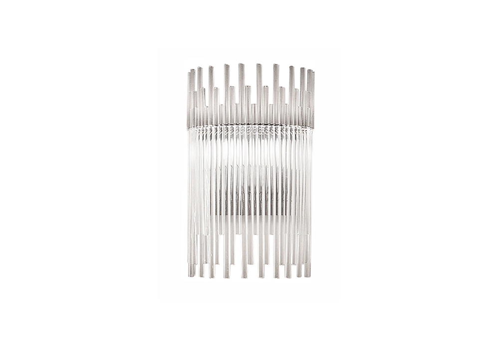 Diadema conçue par Romani Saccani Architetti Associati pour Vistosi est une applique avec structure portante en métal peint. Le diffuseur est structuré par une série d'éléments en cristal tubulaires placés côte à côte et protégeant une source lumineuse avec connexion E27/G9/R7S de type LED ou halogène dimmable. Diadema est disponible en différents modèles.