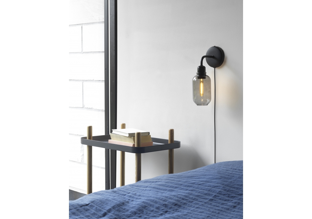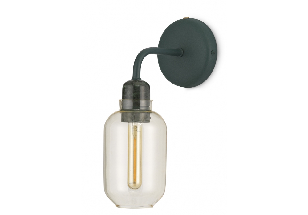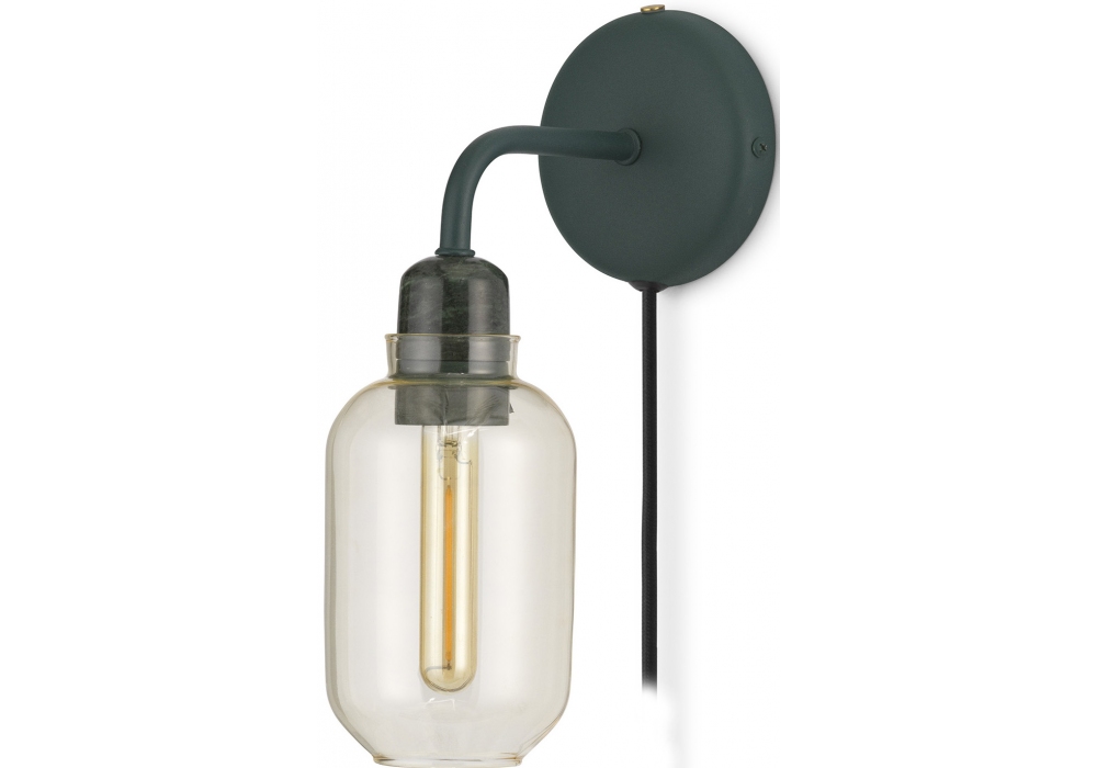 Amp conçue par Simon Legald pour Normann Copenhagen est une applique murale, avec fixation murale et structure en métal verni en poudre vert ou noir. L'abat-jour est cylindrique en verre ancré au porte-lampe en marbre et adopte une source lumineuse LED (non incluse) alimentée par un câble en fibre textile de la même couleur que la structure. Amp est disponible en deux finitions, vert avec une teinte dorée ou noir avec une teinte fumée.