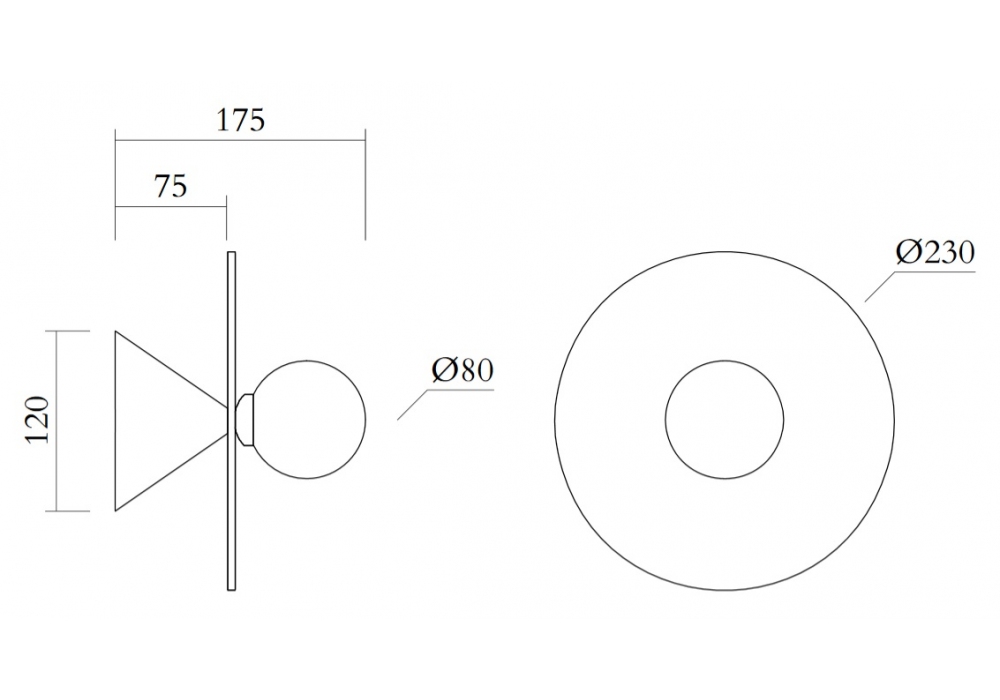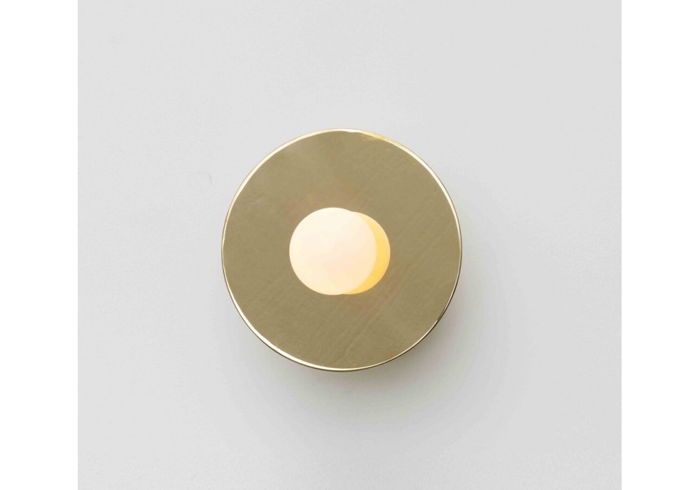 Disc and Sphere conçue par Atelier Areti est une applique en métal peint, disque en laiton poli ou chromé, diffuseur en verre blanc. Auvent disponible en différents modèles.