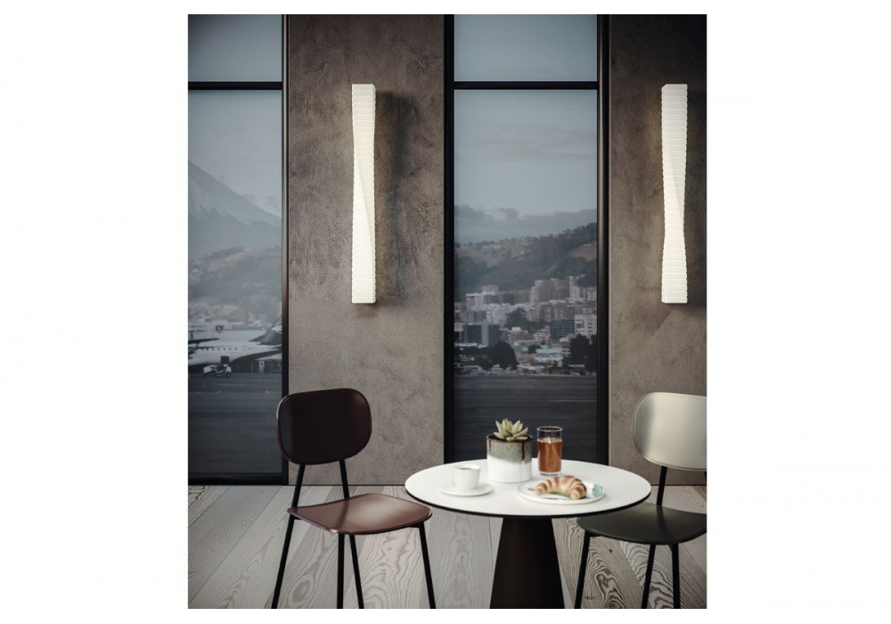 Spin conçue par Fabio Novembre pour Slide est une applique qui rappelle la torsion d'un élément parallélépipédique à base carrée. Disponible en différentes finitions