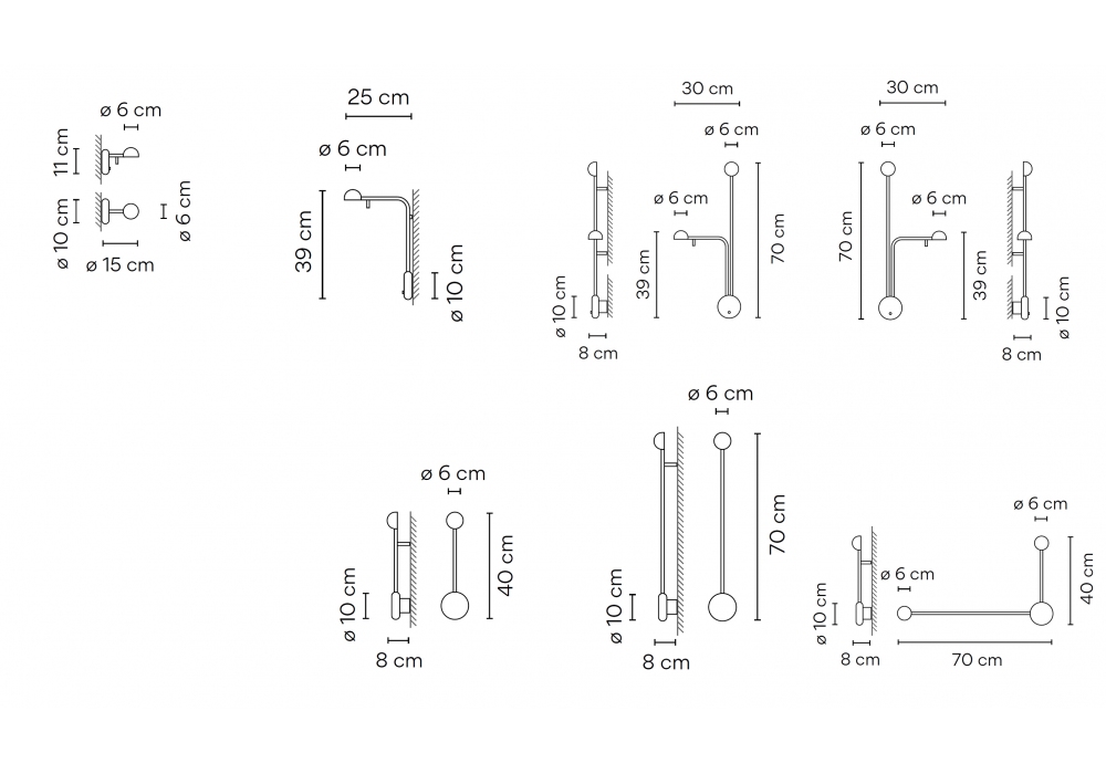 | Dimensions | 15 x H 11 cm; Ø 10 x 25 H 39 cm; 30 x 8 xH 70 cm; 30 x 8 xH 70 cm; 6 x 8 x H 40 cm; 6 x 8 x H 70 cm; 70 x 8 x H 40 cm. |