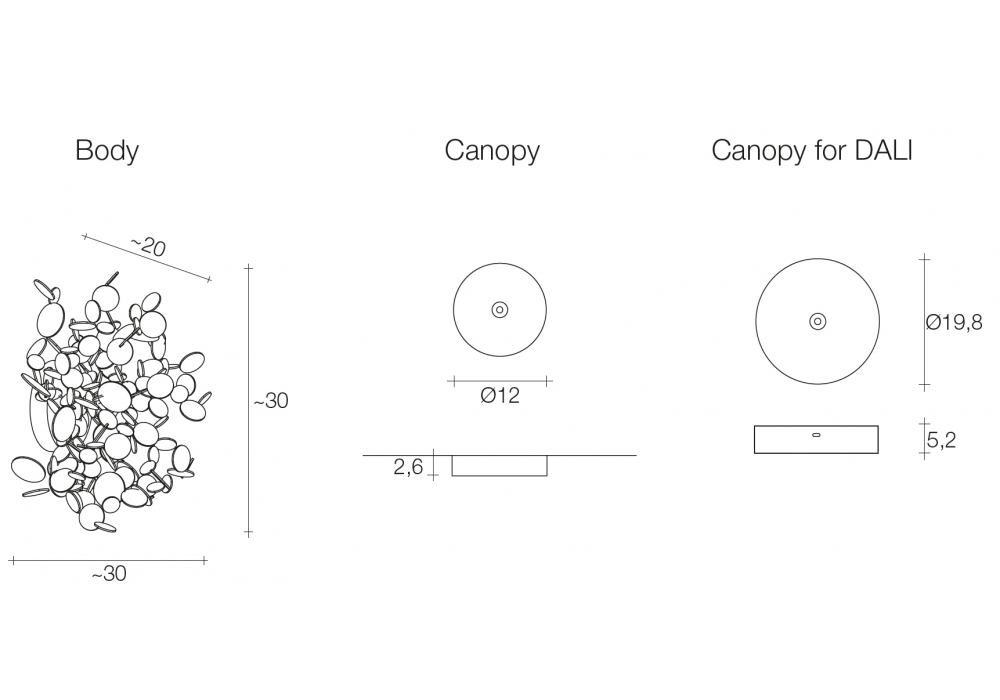 | Plafond rose | Ø 12 x H 2,6 Kg (no Dimm.); Ø 19,8 x H 5,2 Kg (Dimm Dali.). |