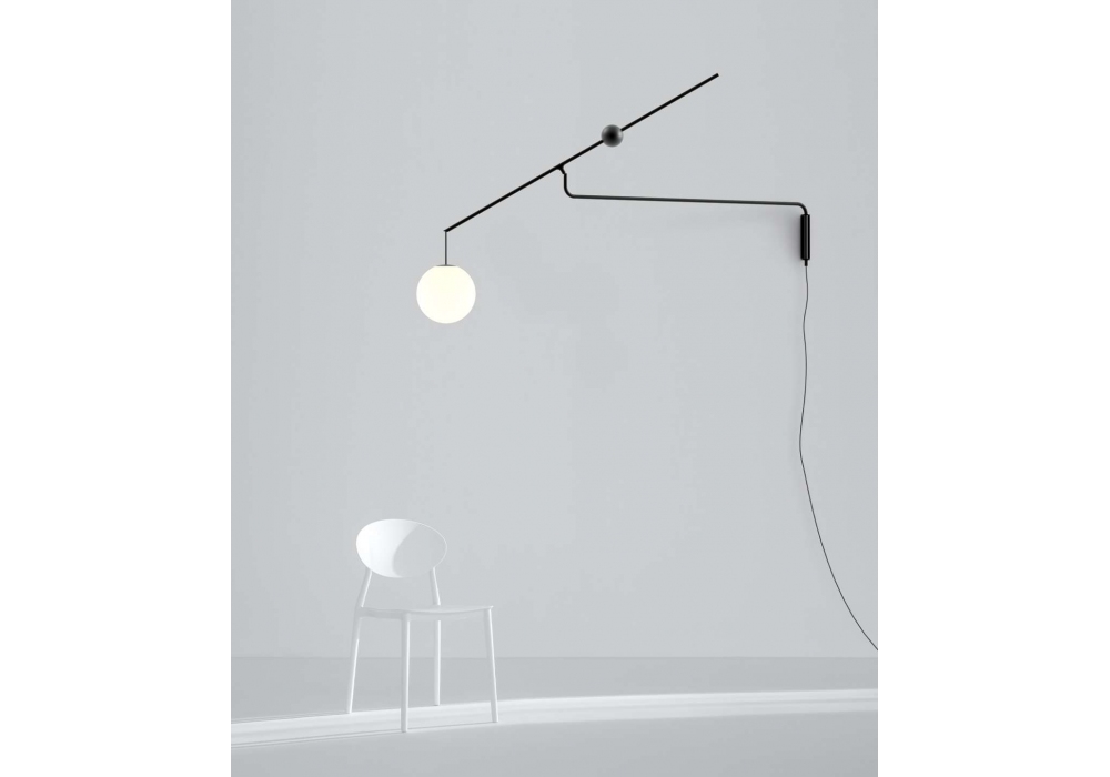 Malamata conçue par Shulab pour Luceplan est une applique avec structure en acier noir mat ou laiton brossé et diffuseur en verre soufflé blanc opale. En exploitant le mouvement du contrepoids, il est possible d'orienter le diffuseur.