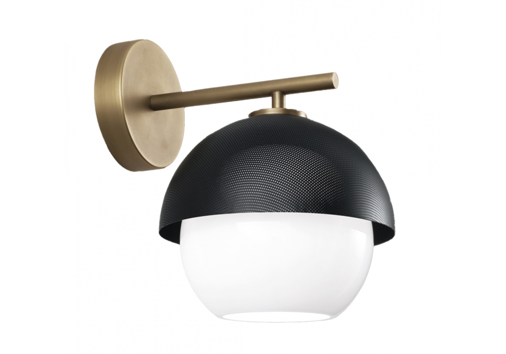 Urban Wall conçue par Massimo Tonetto pour Venicem est une applique à lumière diffuse. Egalement disponible en version "Turnig Arm" avec bras pivotant. Structure en laiton bruni clair ou foncé avec abat-jour en métal perforé or mat ou noir mat. Diffuseur en verre de Murano soufflé blanc. Kit variateur vendu séparément.