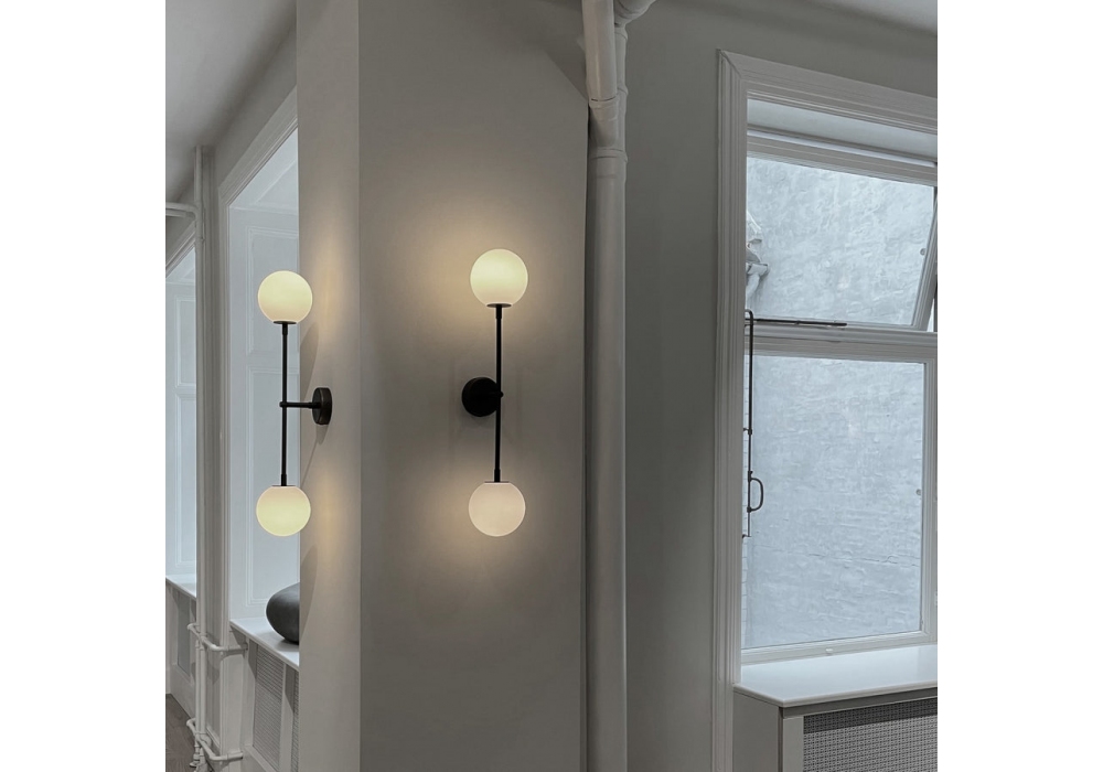 Drop Bulp conçue par Kristian Sofus Hansen & Tommy Hyldahl pour 101 Copenhagen est une applique murale en métal finition grise et abat-jour en verre opale.
