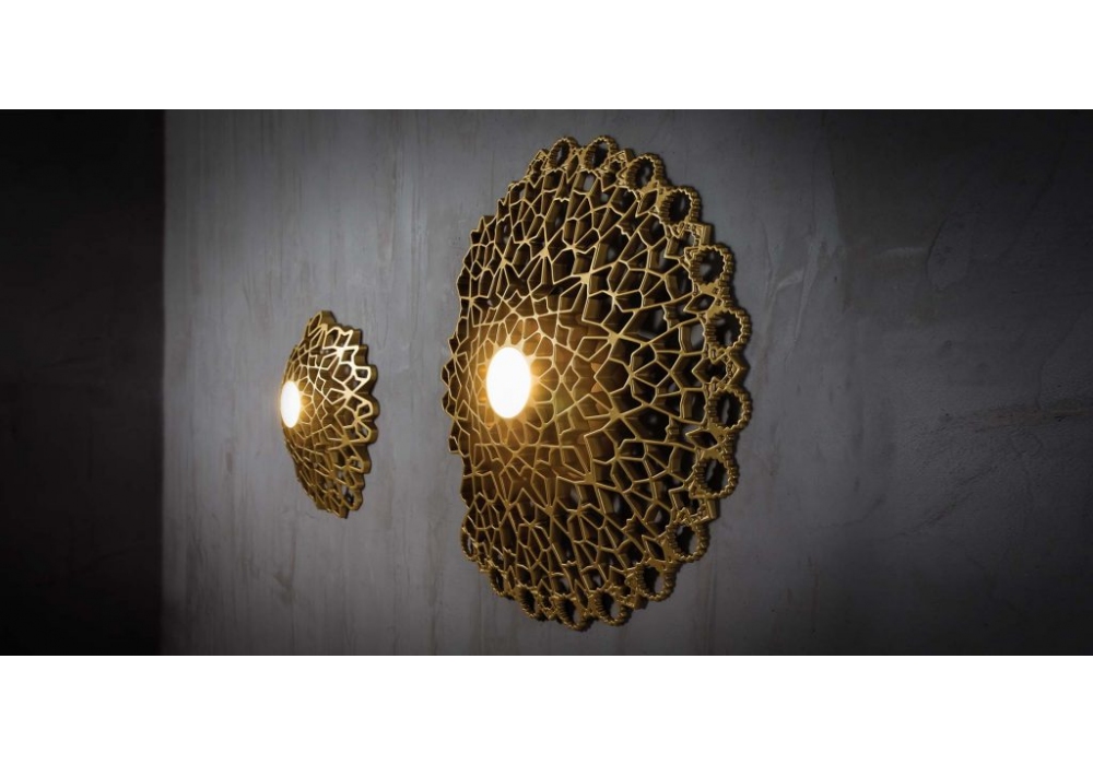 Notredame par Luca De Bono et Dario De Meo est une applique murale à LED avec structure en technopolymère doré ou blanc. Usage interne.