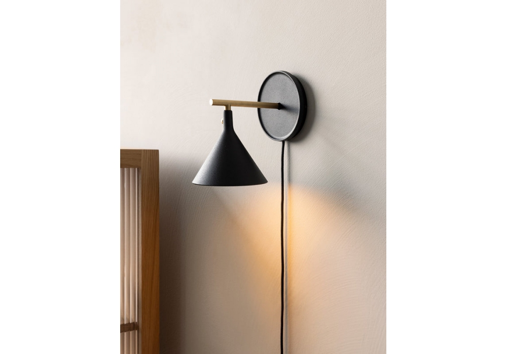 Cast Sconce conçue par Tom Chung & Jordan Murphy pour Audo Copenhagen est une applique réalisée en aluminium peint en noir, parties métalliques en laiton brossé.