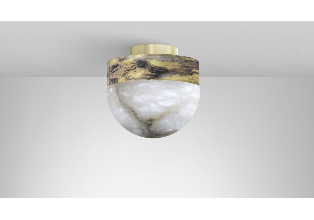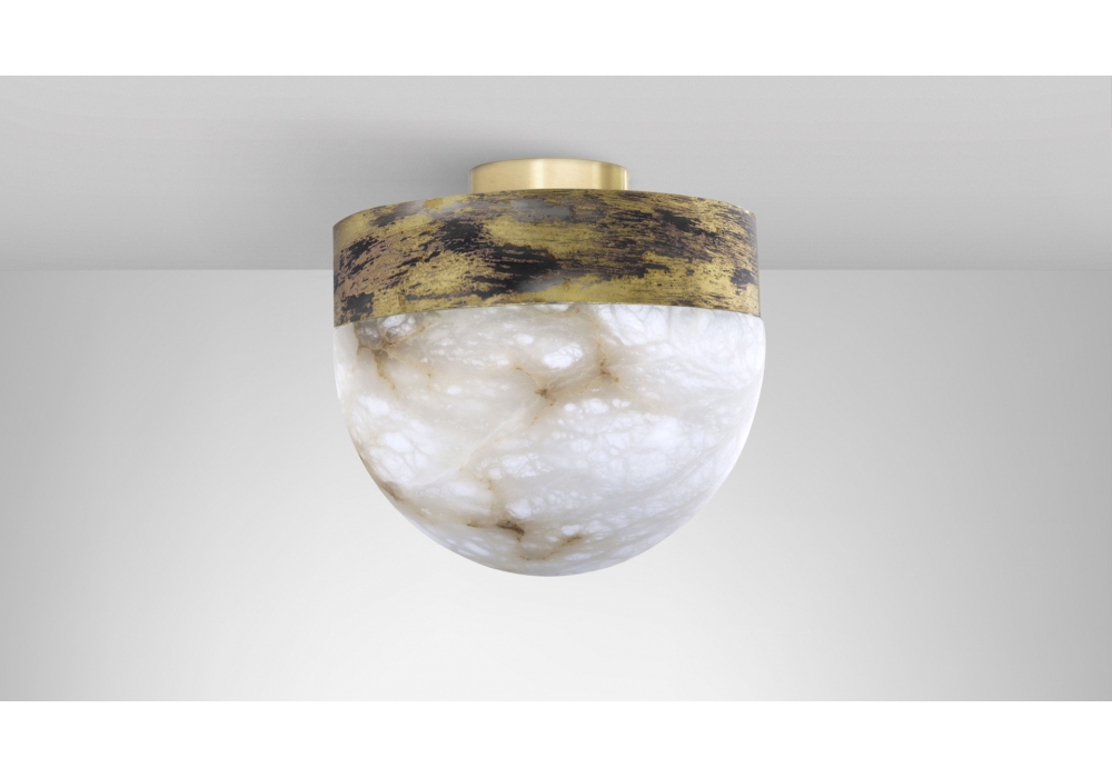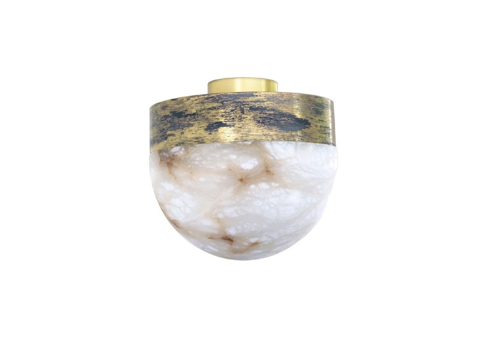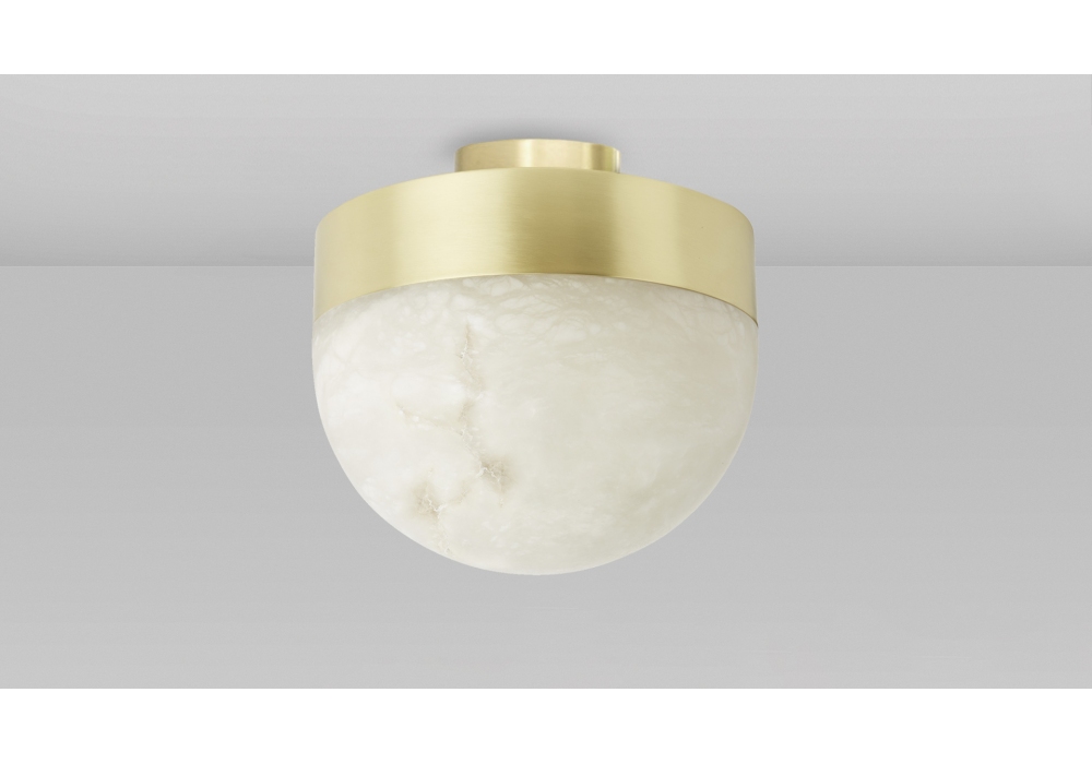 Lucid Flush conçue par CTO Lighting est une applique/plafonnier réalisée avec une structure en bronze, laiton satiné ou laiton oxydé argent et abat-jour en albâtre poli. Disponible en 2 dimensions.