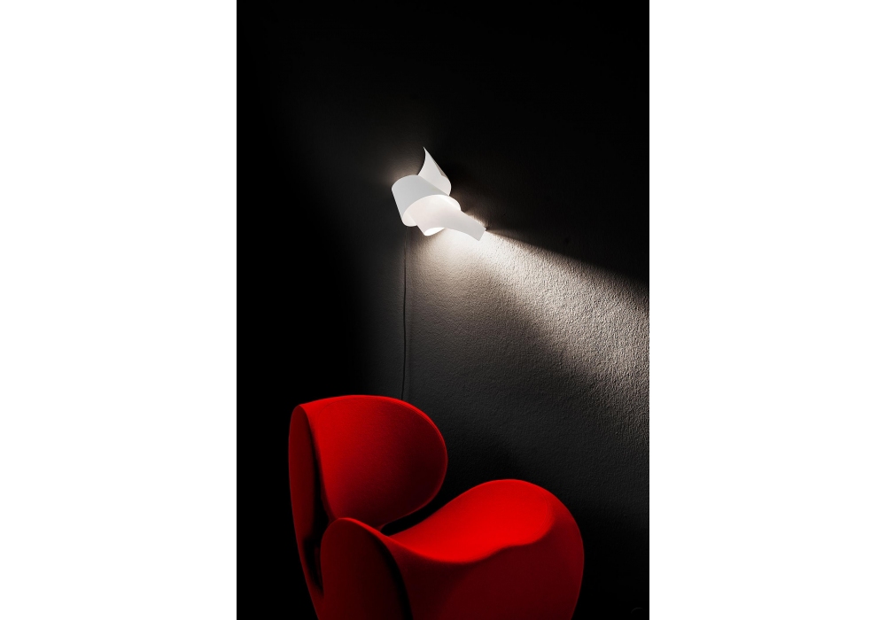 Oop's 2 conçu et produit par Ingo Maurer est une applique composée d'une bande de papier fixée au mur avec une épingle. La source de lumière est cachée sur la face inférieure. En papier Gmund, acier et plastique. Câble incolore. Disponible avec prise EU ou US.