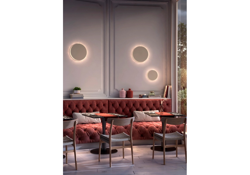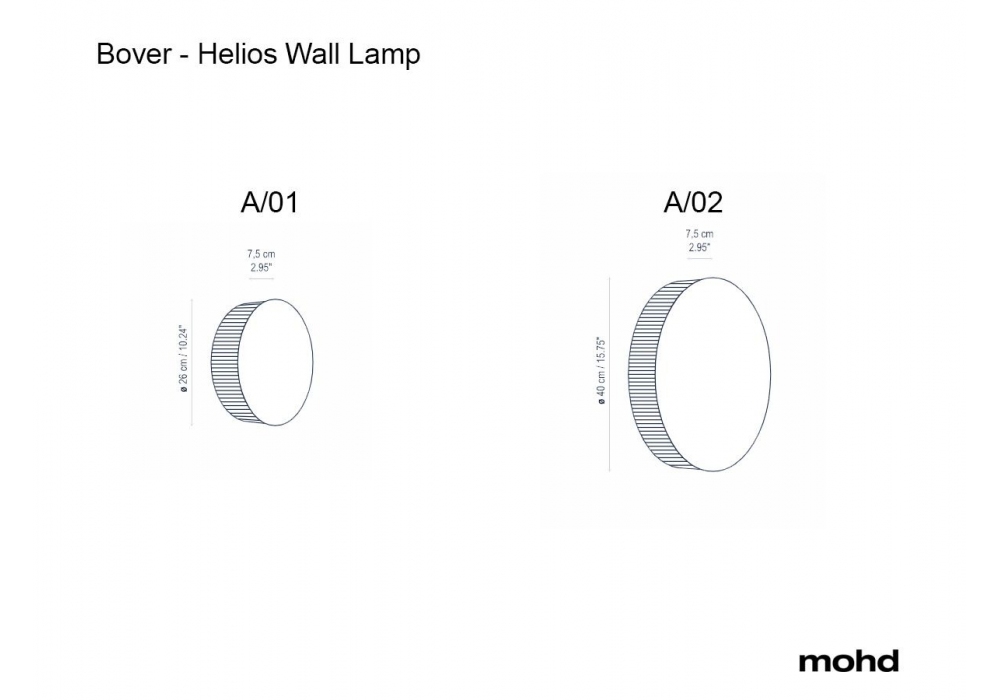 Helios conçue par Gonzalo Milà pour Bover est une applique circulaire avec support et structure porteuse en métal et aluminium peint. L'abat-jour est en fils de coton et abrite une source lumineuse de type LED avec un système de variateur triac. Hélios est disponible en différents modèles.