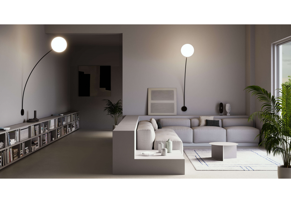 Filo conçue par Defne Koz et Marco Susani pour Italamp est une applique LED avec diffuseur en verre soufflé blanc et structure en métal finition or clair brossé ou noir mat.