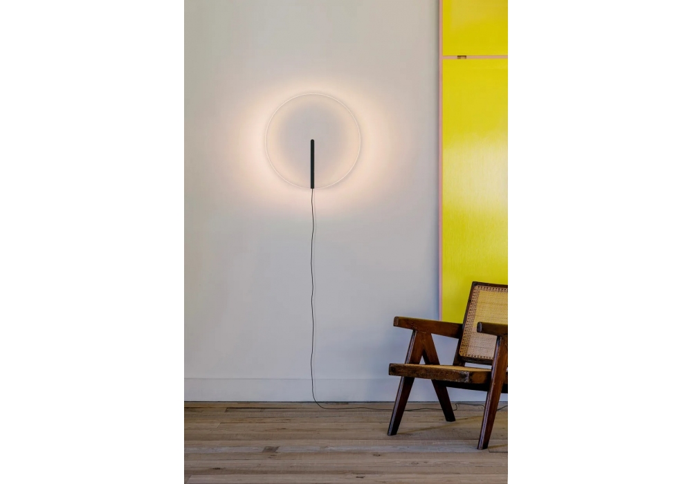 Guise conçue par Stefan Diez pour Vibia est une applique avec support en aluminium peint couleur graphite. Le diffuseur est en verre borosilicaté circulaire et protège une source de lumière LED avec capteur optique. Guise est disponible en différents modèles.