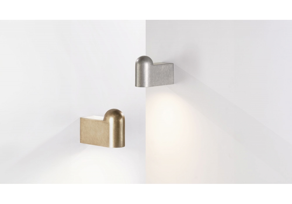 Bell conçue par AFTR Studio pour Rakumba est une applique caractérisée par de l'aluminium brut ou du bronze naturellement vieilli et est également disponible avec des finitions thermolaquées.