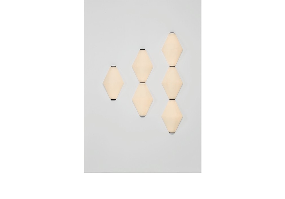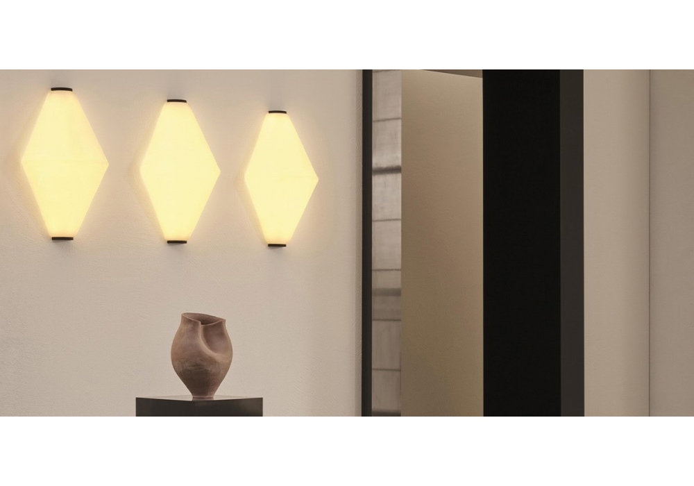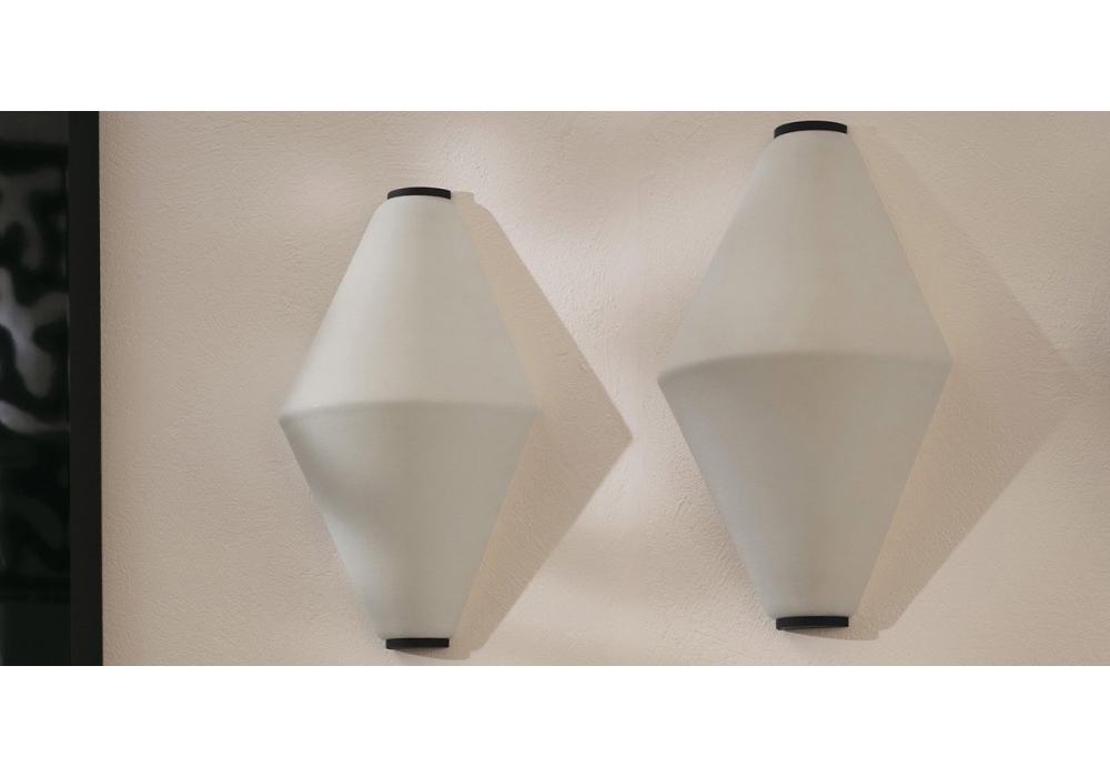 Helium conçue par Elisa Ossino pour DePadova est une applique réalisée avec une structure en métal thermolaqué noir mat "soft touch". Son diffuseur est en verre Triplex opalin soufflé bouche, gravé à l'acide, ou en verre décoré à la main effet sablé.