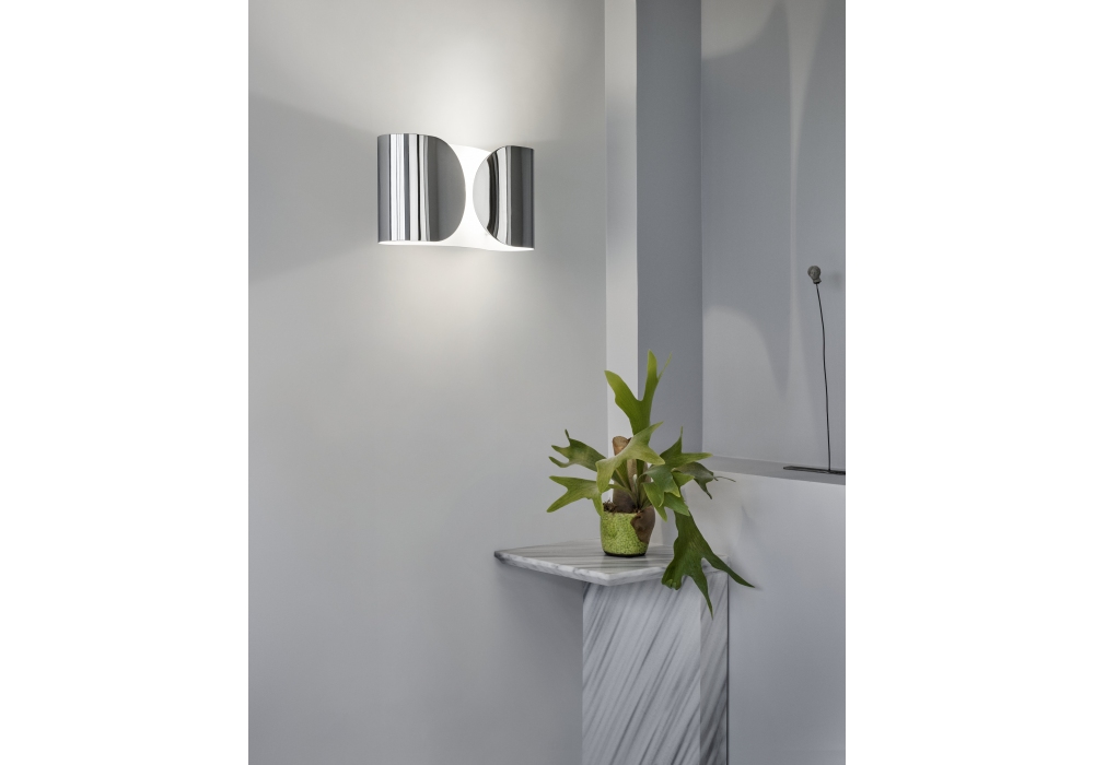 Foglio conçue par Tobia Scarpa pour Flos, est une applique à lumière directe, indirecte et partiellement diffuse. La fixation murale est en acier découpé, plié et thermolaqué blanc brillant. Le diffuseur est également en acier découpé, courbé et thermolaqué. Les deux supports de douille sont en nylon blanc moulé par injection. Réglable à distance (variateur non inclus). Ampoules non incluses.