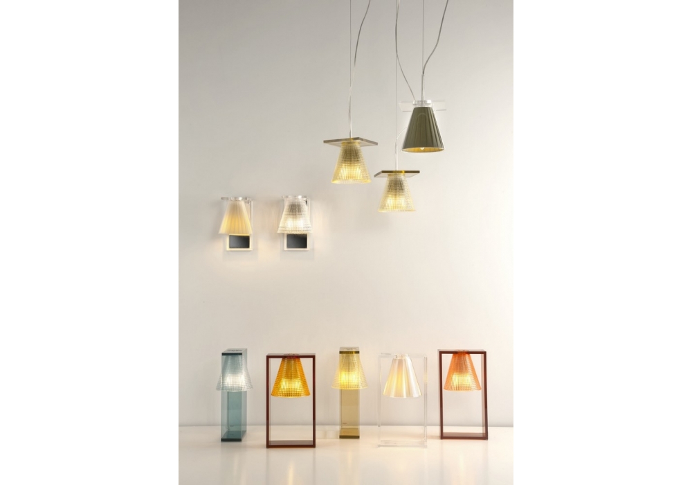 Light-Air conçue par Eugeni Quitllet pour Kartell est une applique réalisée avec structure en technopolymère thermoplastique transparent et diffuseur rembourré en tissu.