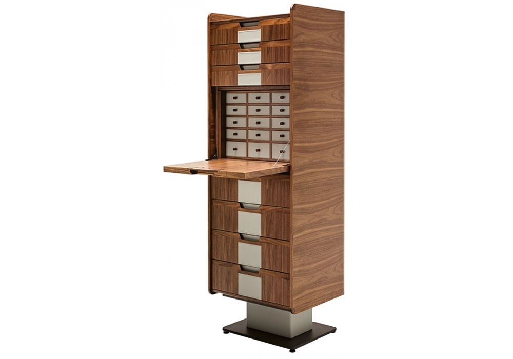 Corium conçue par Umberto Asnago pour Giorgetti est une commode haute avec structure en contreplaqué de peuplier, placage et noyer canaletto massif, en différentes finitions. La base est en métal peint en bronze, avec des façades de colonnes et de tiroirs recouvertes de cuir de selle. La commode est équipée de 7 tiroirs avec glissières coulissantes entièrement extractibles et rétractables et d'une porte à rabat avec 15 tiroirs intérieurs.