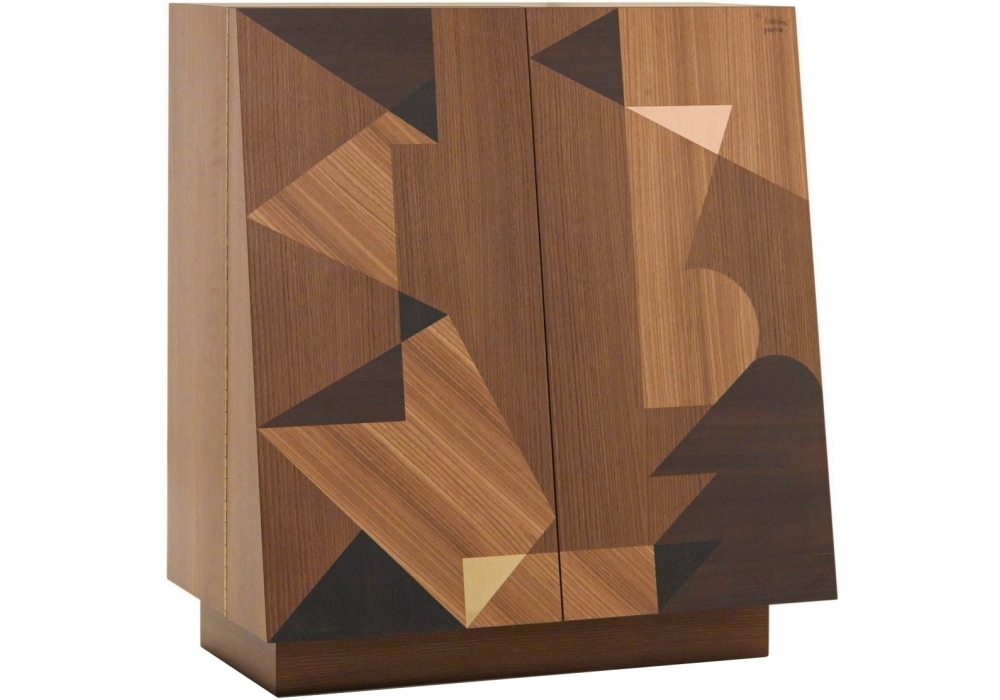 Schermo designed by Alessandro Mendini is a square cupboard on a base with a sloping hinged door. It is created with an inlaid design on the front, achieved by combining three different types of wood – elm, oak and acacia – according to abstract geometric compositions that meld the points of the triangle with the curved contours of the circle in unexpected directions.