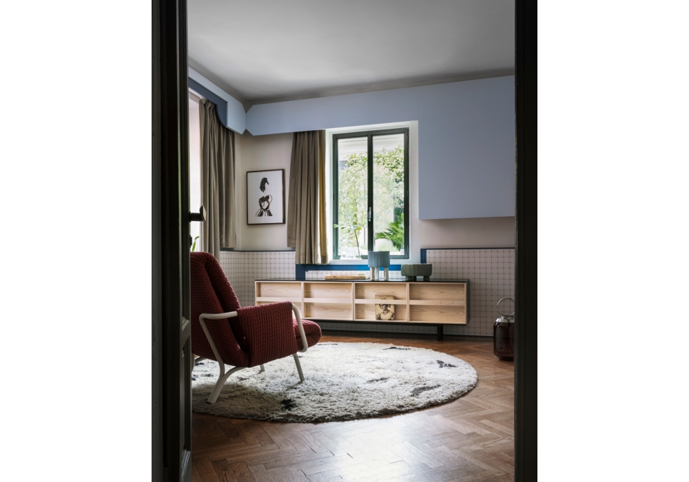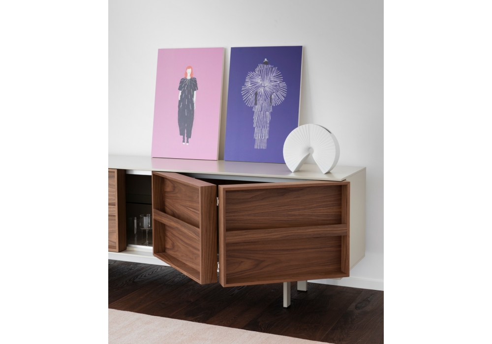 Ramblas conçue par E-ggs pour Miniforms est une collection de buffets avec structure et base en métal laqué disponible en différentes couleurs. Portes coulissantes avec système d'ouverture semblable à un livre en bois ou dans les mêmes couleurs que la structure.
