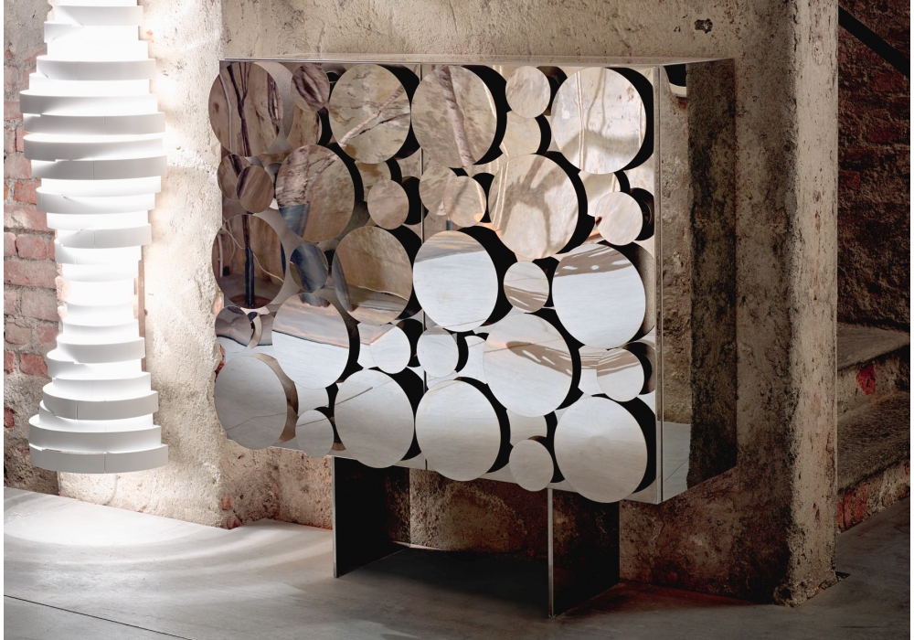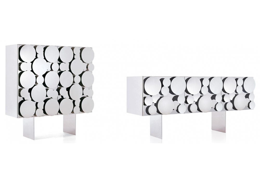 Collection Gagà conçue par Maurizio Galante pour Opinion Ciatti est un buffet avec deux portes ou un buffet bas avec deux portes et un tiroir. Structure en MDF laqué recouvert d'acier inoxydable poli. Deux étagères intérieures en verre. Signature du créateur gravée. L'intérieur du buffet est disponible dans un choix de 213 couleurs RAL Classic.