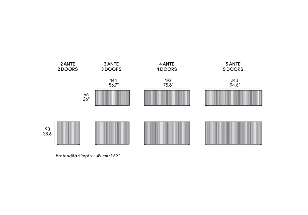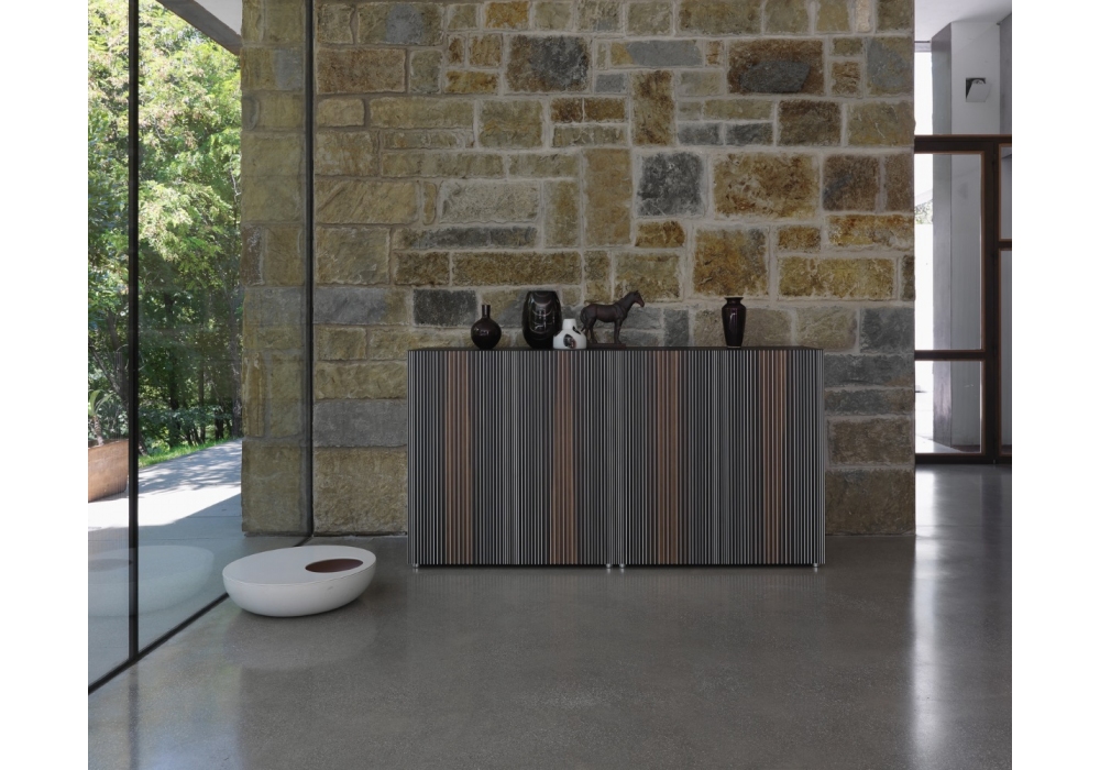 Carlos conçue par Renato Zamberlan pour Horm est une collection de buffets avec structure en panneaux de particules plaqués et teints ou laqués. Portes en nid d'abeille MDF avec renforts transversaux internes en métal, plaqués en chêne traité thermiquement et fraisés verticalement pour recevoir des inserts verticaux en stratifié blanc pleine couleur. Étagères internes en verre trempé transparent.