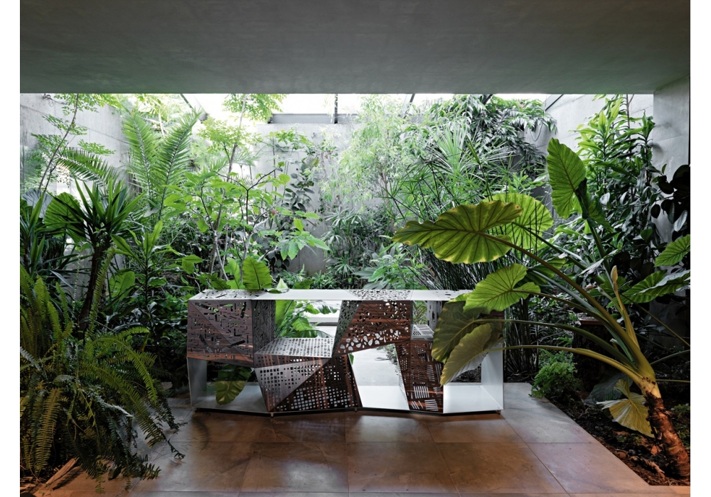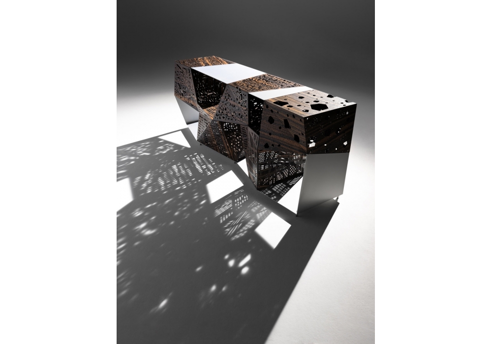 Riddled Buffet conçu par Steven Holl pour Casamania & Horm est un buffet. Il se compose de cinq conteneurs différents équipés d'une porte ouvrante à fermeture magnétique, fabriqués avec un matériau créé et breveté par Horm composé d'un sandwich de placage d'ébène et de tissu qui, grâce à des incisions de surface réalisées avec découpe au laser, est plié comme un origami . Les conteneurs sont reliés entre eux par des panneaux en aluminium peint.