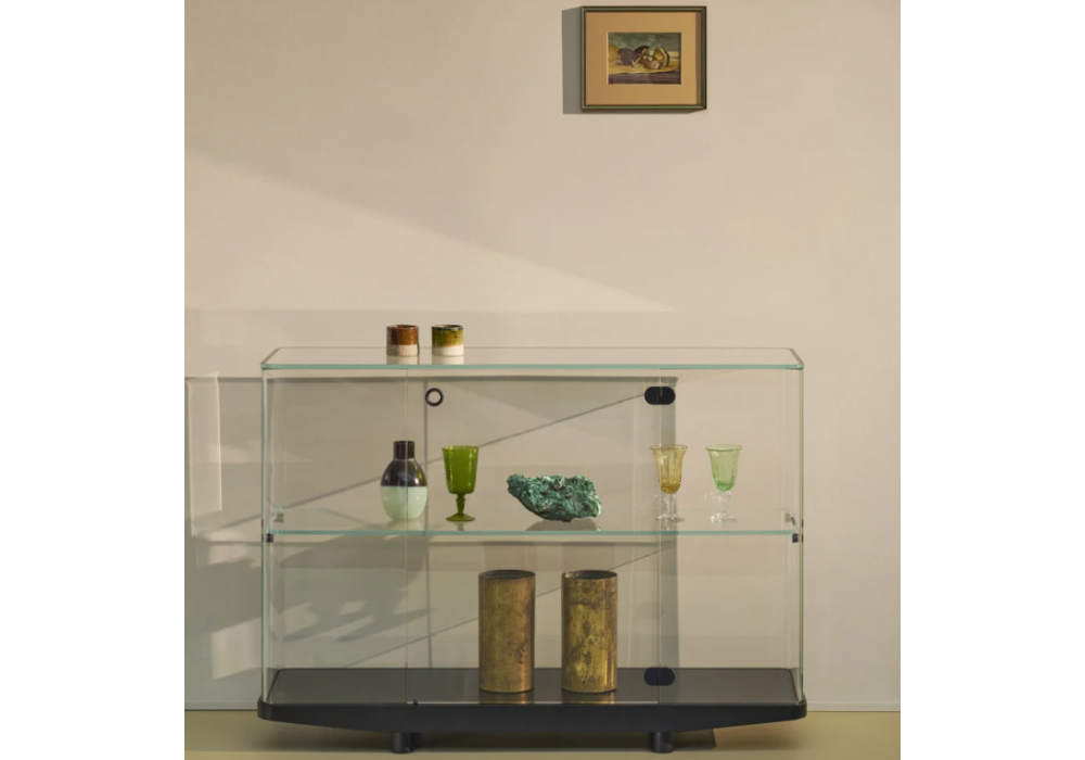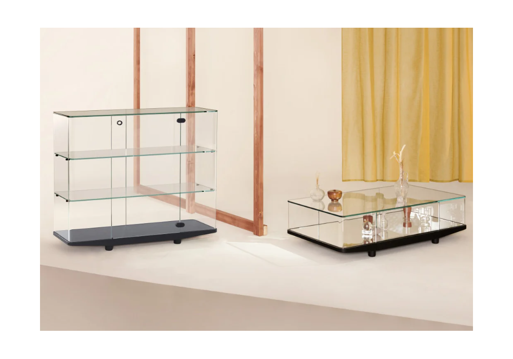 Collector conçu par Edward Barber & Jay Osgerby pour Glas Italia est une vitrine aux côtés incurvés qui épousent la forme du plateau en verre clair ou en cristal argenté. Les bases sont en frêne massif laqué noir à pores ouverts. Disponible en différentes tailles.
