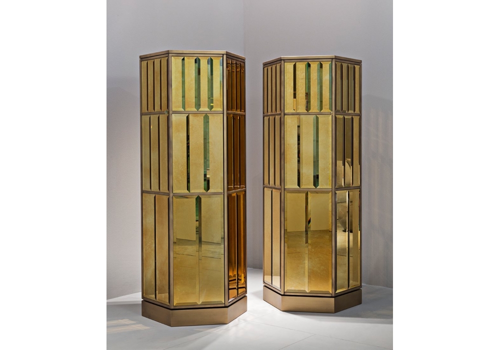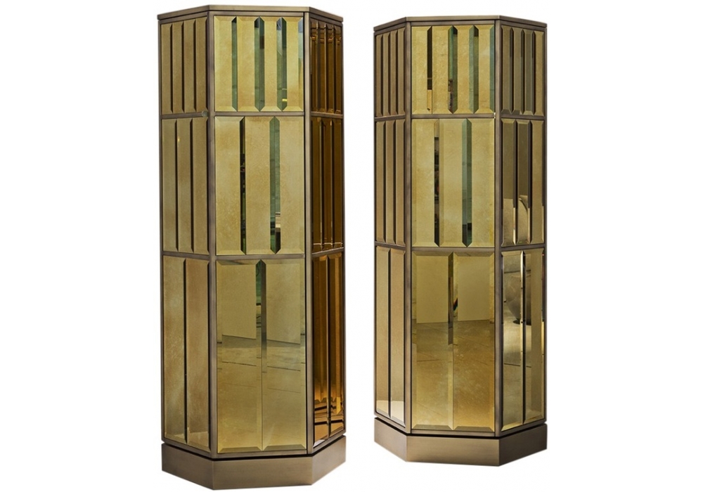 Ludwig Diamond designed by Andrea Parisio for Meridiani is a sideboard with wooden frame with bronzed brass varnished wooden inserts. The external finish is beveled bronzed mirror. The internal finish is in matt elephant lacquer. Available in platinum steel varnished with internal finish matt putty lacquer.