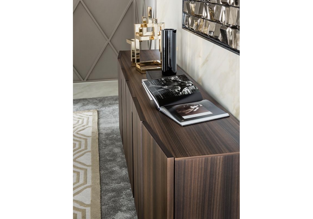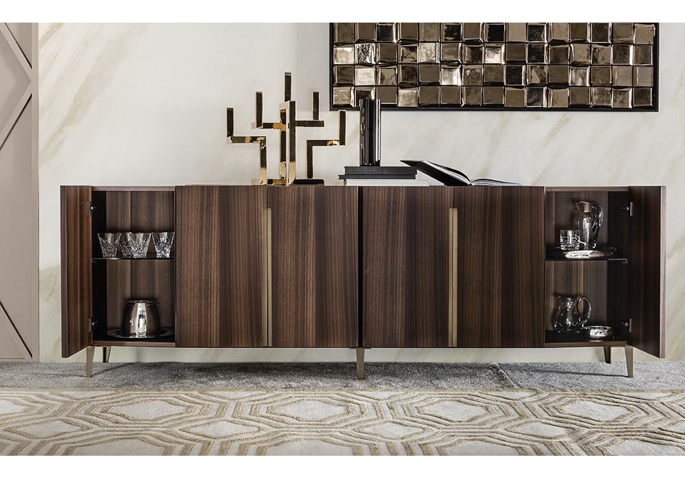 Garbo by Casamilano Studio est un buffet avec structure en MDF recouvert d'eucalyptus traité thermiquement ou de chêne fumé, poignées et pieds en métal finition laiton et étagères en verre trempé bronze.