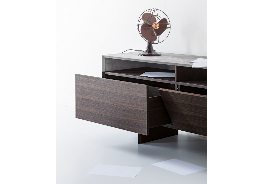 Marble Arch conçue par Matteo Nunziati pour Lema un buffet avec deux tiroirs et une porte. Plateau en finition gris béton et structure en chêne thermotraité.