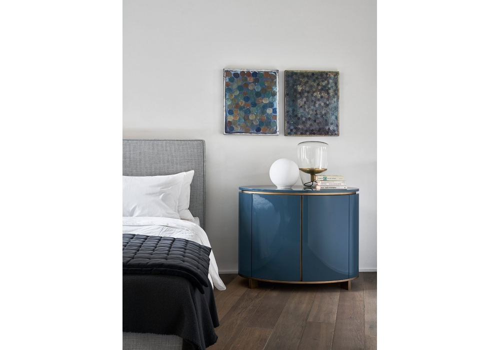 Elliot conçu par Andrea Parisio pour Meridiani est un buffet avec deux portes et une étagère, structure en bois avec insertions. Disponible en finition laqué mat ou brillant. Insertions verni couleur laiton bronzé ou laque mate ou