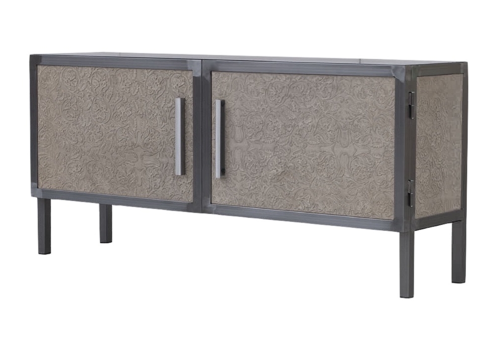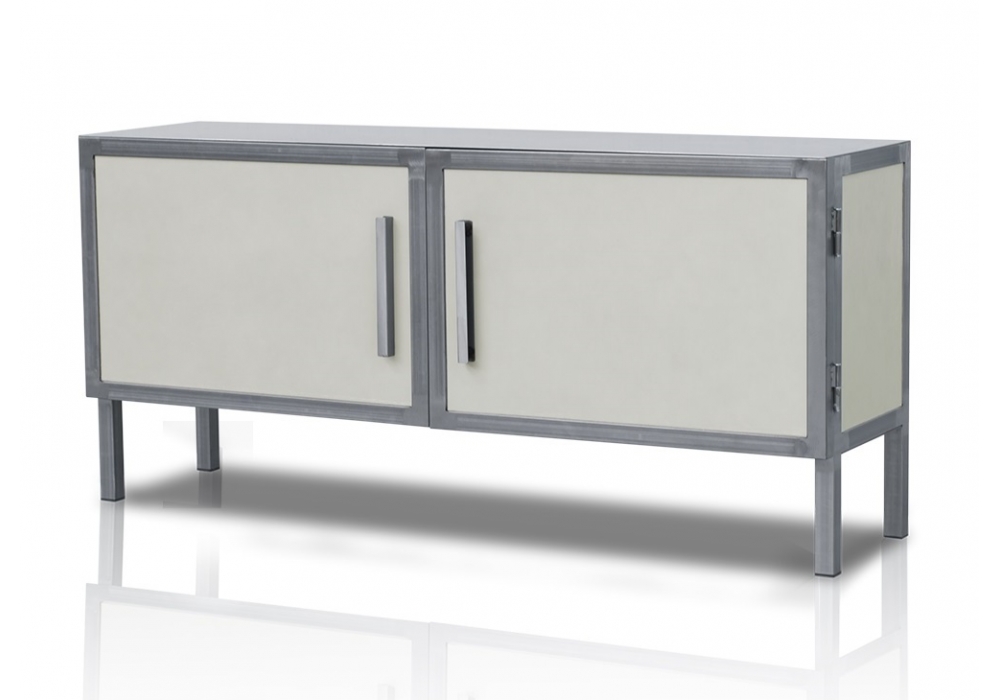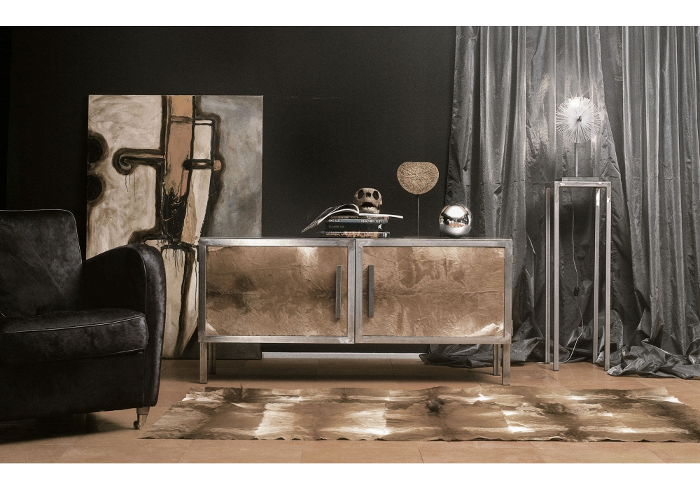 Frida conçue par Baxter P. est un beau buffet avec structure en métal tubulaire inachevé avec plateau, base et dos en feuille noire. Soudure et lissage visibles, avec protection antioxydante avec émail mat clair et finition cire. Panneaux extérieurs et intérieurs en contreplaqué tapissés en cuir. Étagère en verre.