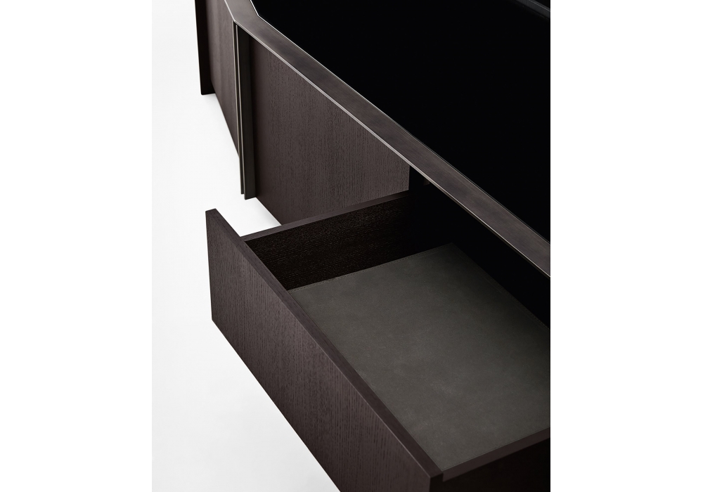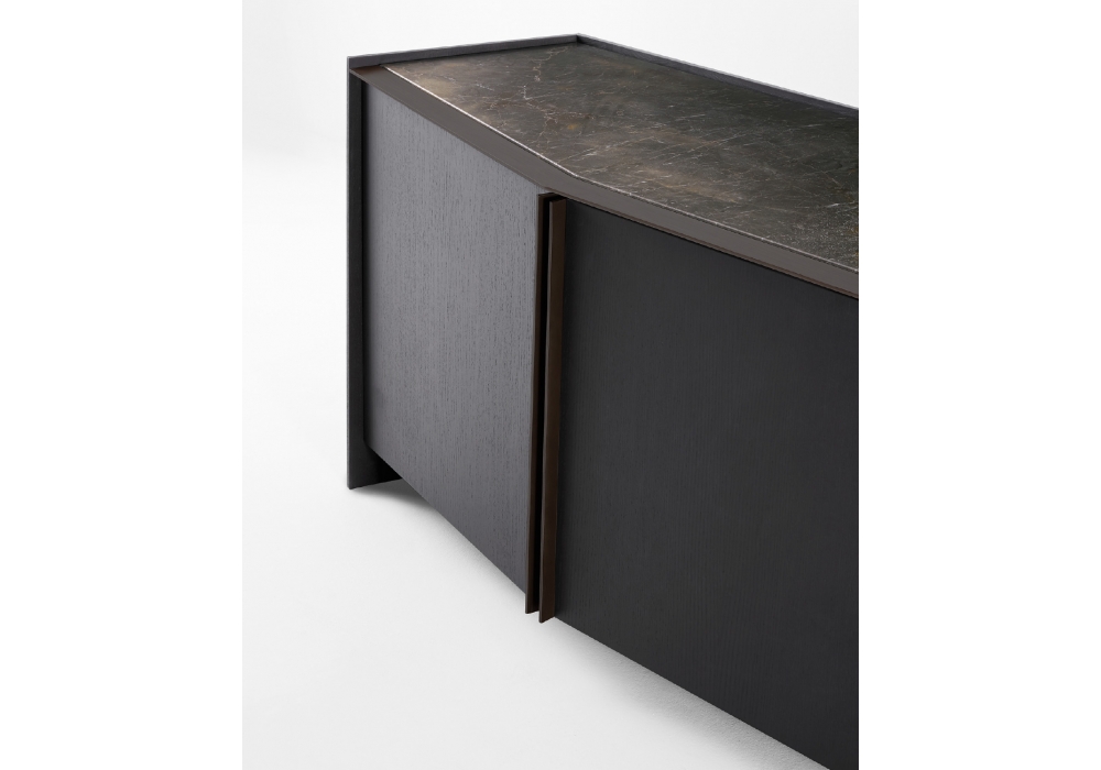 Athus conçue par Oscar & Gabriele Buratti pour Gallotti&Radice est une crédence en frêne laqué noir pore ouvert. Détails en métal laqué bronze patiné. Haute en marbre Stardust Grey ou Sahara Noir. Disponible aussi en verre trempé verni noir brillant de 6mm d’épaisseur. Avec étagère interne en verre extralight trempé et biseauté de 10mm d’épaisseur. Fonds internes en miroir extralight de 6mm d’épaisseur. Tiroirs avec fond en suédine avec ouverture push-pull seulement pour les versions 48h et 75,5h.