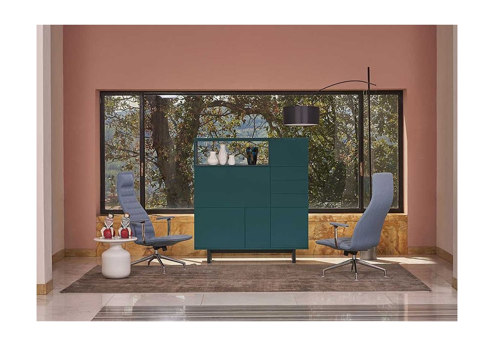 Easy conçu par Cappellini est un cabinet avec portes, tiroirs ou ouvertures caractérisés par une extrême légèreté visuelle. Les plateaux sont disponibles avec une finition laquée ou en bois et marbre. Disponible aussi en différents modèles.