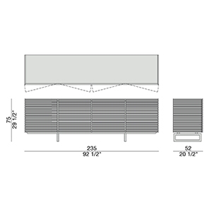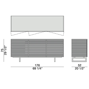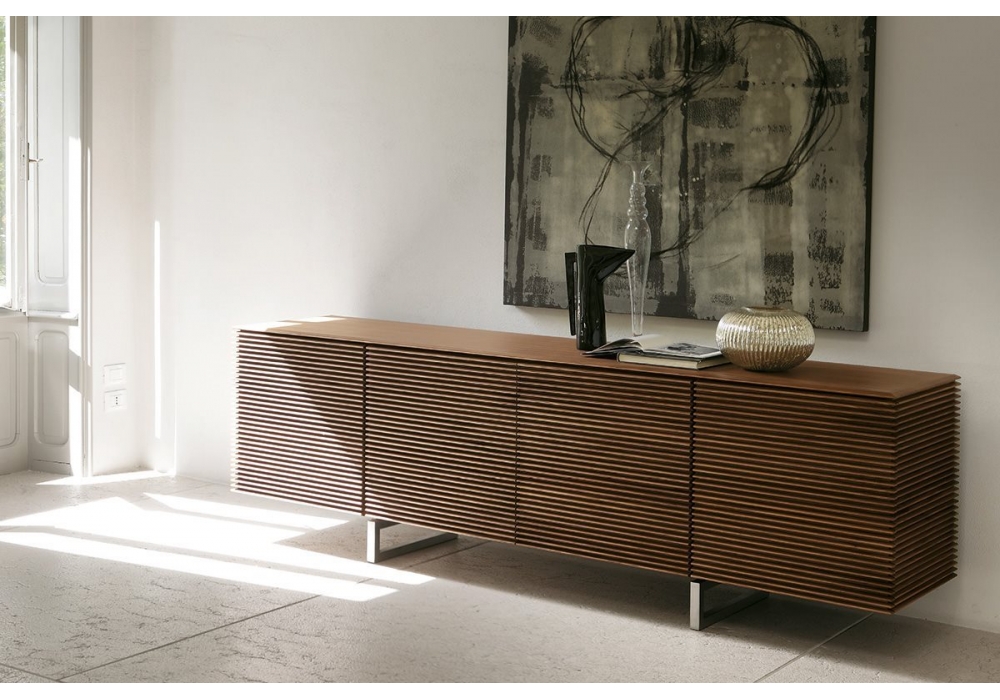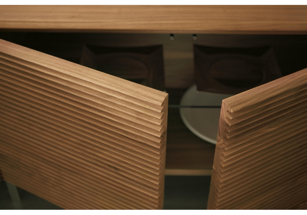 Riga conçu par T. Colzani pour Porada est un buffet avec portes en noyer canaletta massif ou laqué mat pore fermé en différentes finitions. Disponible en différents modèles. Base en chrome satiné.