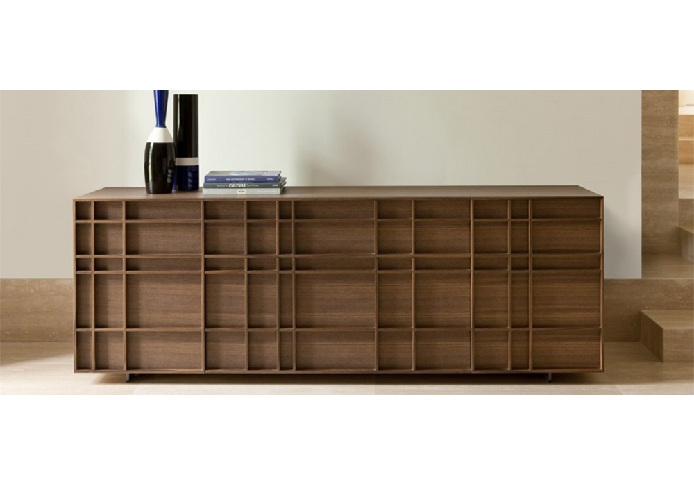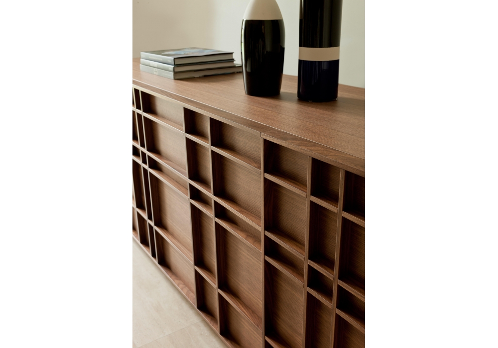 Kilt conçu par Marconato & Zappa pour Porada est un buffet avec décorations en noyer canaletta massif et piétement en métal noir mat. Les poignées pour les portes latérales et les tiroirs centraux (le plus haut réguler et celui du bas profonde) sont rainurés de l’épaisseur de la décoration.