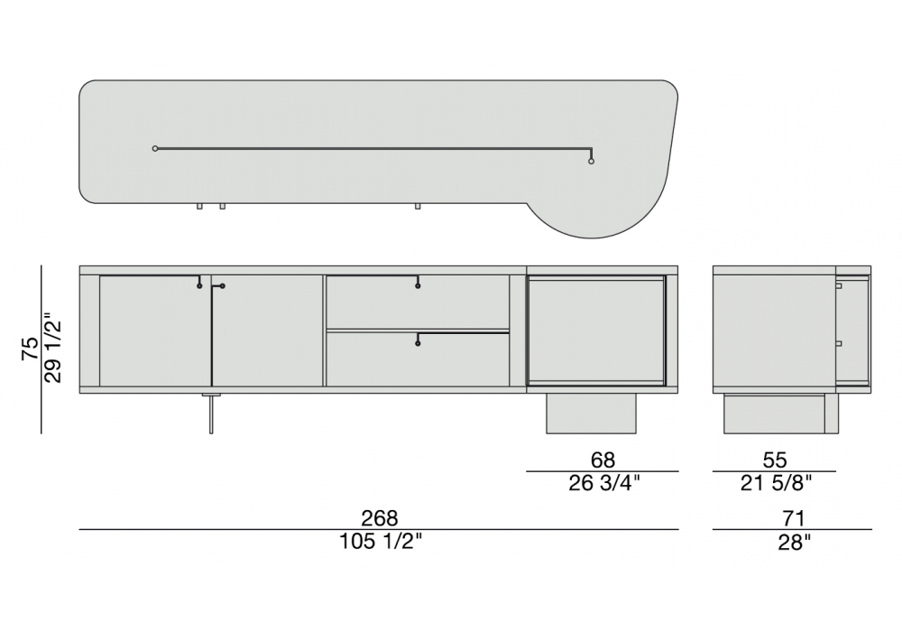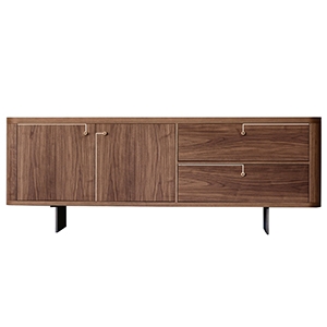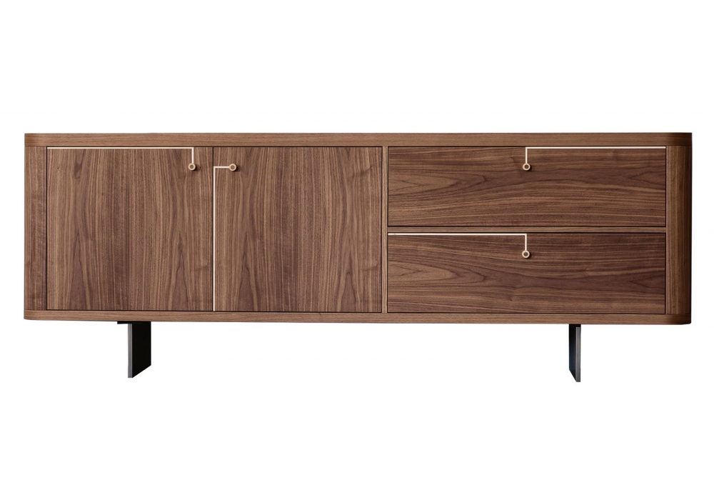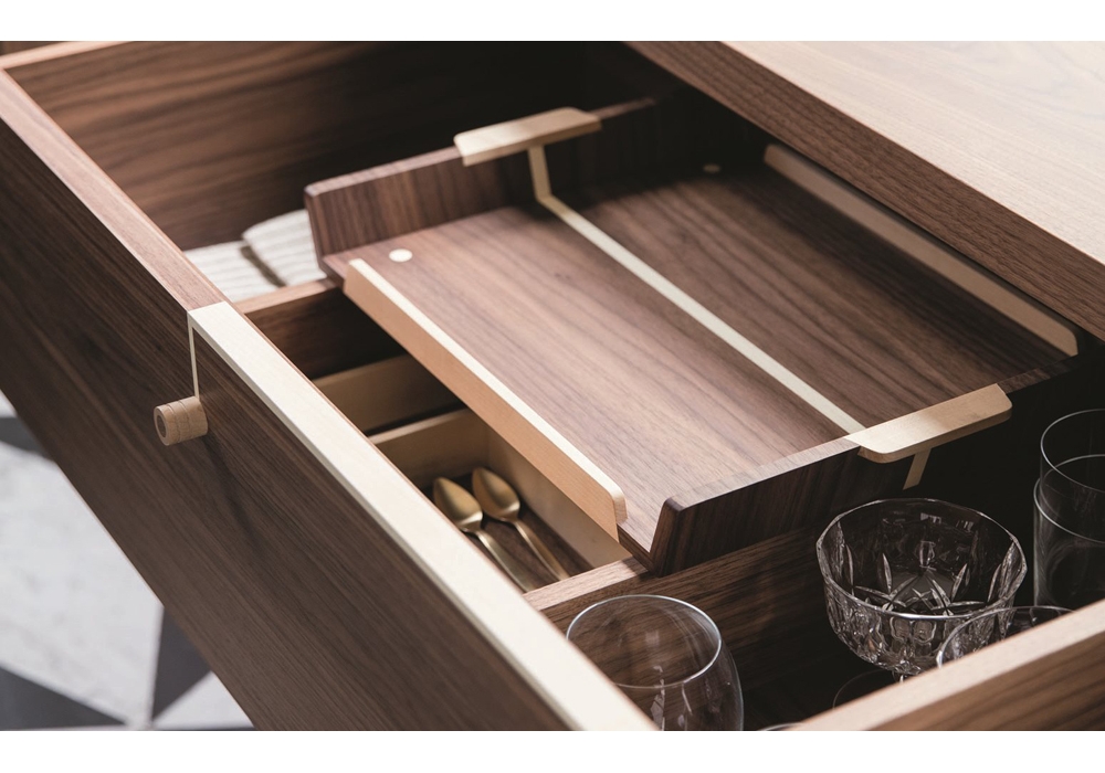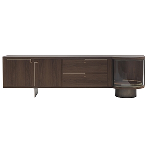 Rondo' conçu par Umberto Asnago pour Porada est un buffet en noyer canaletta avec décoration en érable naturel et piètement en cuivre bronzé brossé avec deux portes et deux tiroirs. En outre disponible dans la version avec un module bar à droite avec porte en verre fumé arrondi, avec élément porte-bouteilles pivotant avec éclairage en LED. Boite pour verres à l’intérieur d’un tiroir et un porte-couverts extractible. Plateau Rondo' inclus.