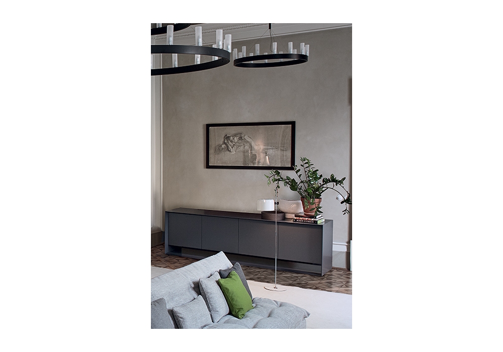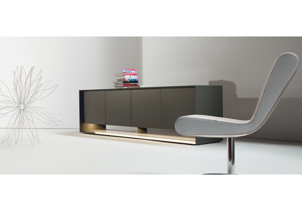 Sunrise conçu par Gino Carollo pour Bonaldo est un buffet avec structure en bois laqué. Également disponible avec source de lumière.