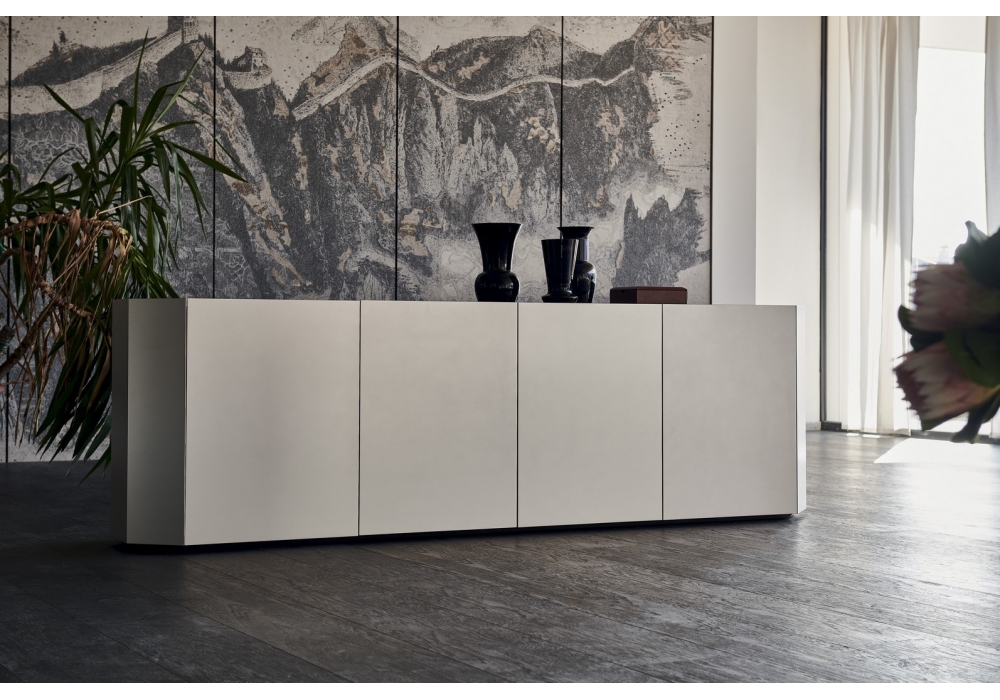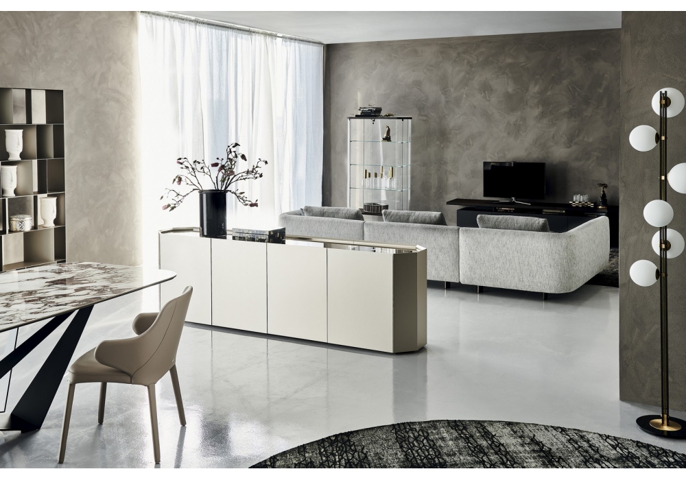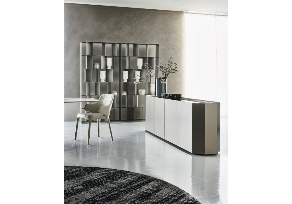 Chelsea conçu par Alessio Bassan pour Cattelan Italia est un buffet avec structure en bois laqué blanc opaque ou titane. Plateau en verre extra-clair laqué blanc ou en verre miroité bronze. Étagères internes en verre clair. Disponible en différentes dimensions.