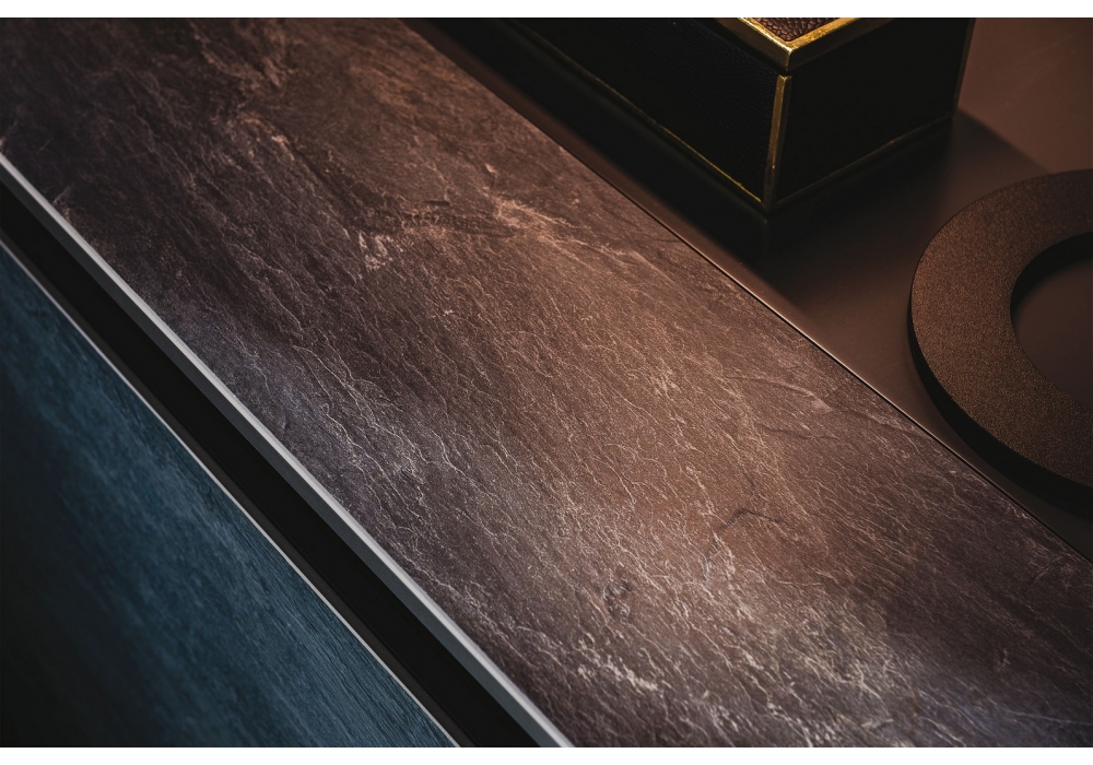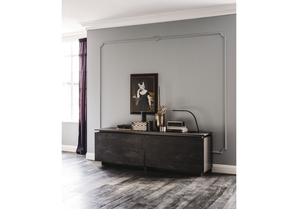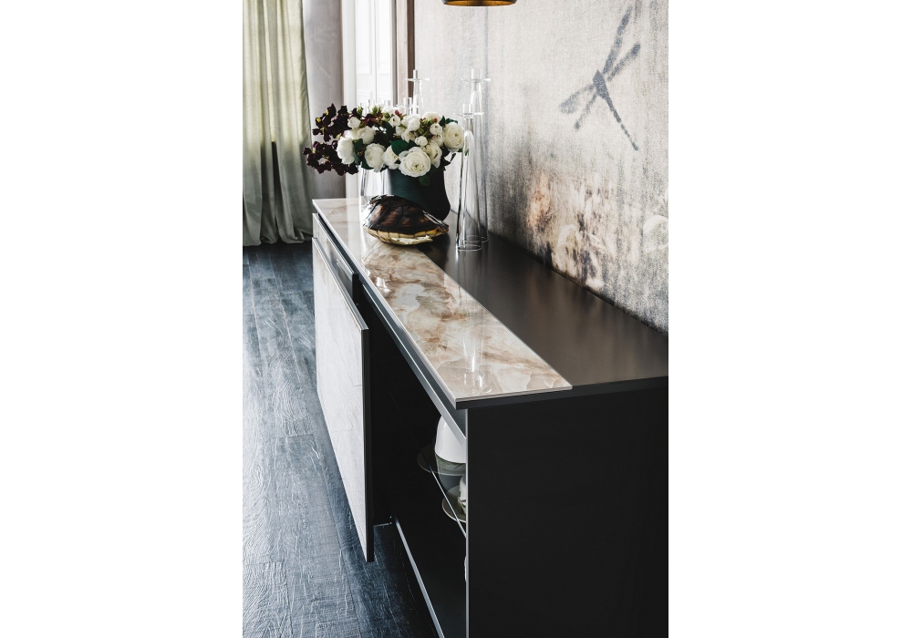 Europa Keramik conçu par Andrea Lucatello pour Cattelan Italia est un buffet avec structure laqué graphite opaque. Portes coulissantes et insert du plateau en différentes finitions en céramique Marmi ou en céramique Zinc en couleur Brown. Étagères internes en verre extra-clair.